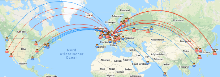 Энэ бол захидал хаанаас ирж, хаашаа явсан тухай харуулсан газрын зураг. Улаан маршрут нь илгээсэн, цэнхэр нь хүлээн авсан замнал.