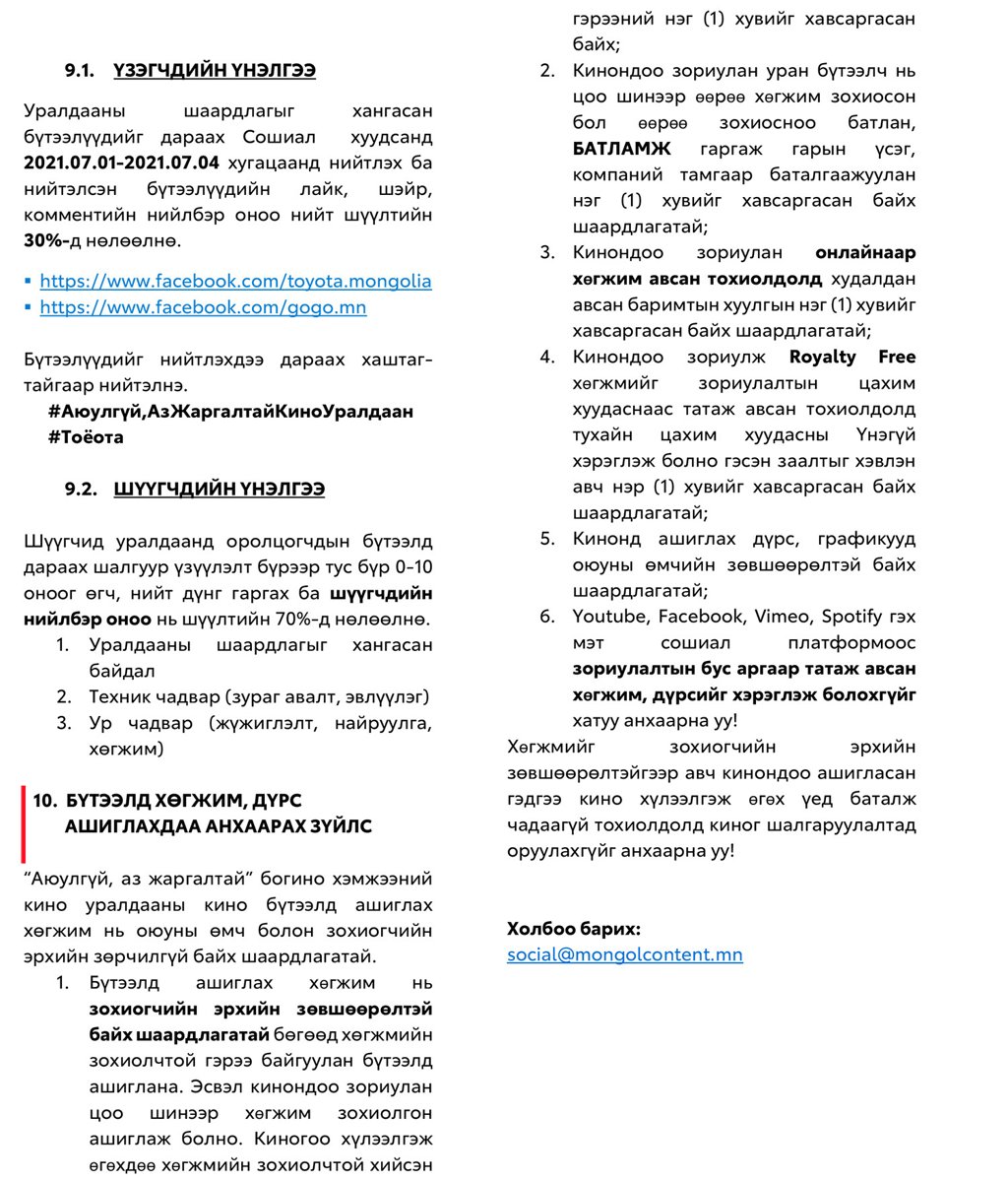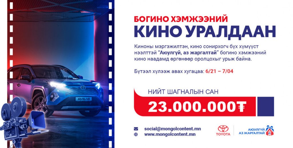 Зам тээврийн ослын тоог бууруулах, жолооч нарыг замын хөдөлгөөнд соёлтой, зөв оролцохыг кино контентоор дамжуулан уриалах зорилготойгоор "Тоёота Сэйлс Монголиа" ХХК, "Монгол Контент" ХХК хамтран "Аюулгүй, Аз жаргалтай" богино хэмжээний кино уралдааныг зарлалаа.