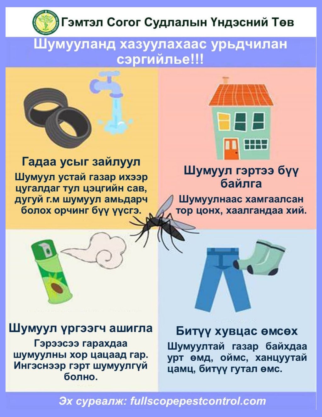 Шумуулд хазуулсан үед ямар арга хэмжээ авах талаар Гэмтэл согог судлалын үндэсний төвөөс дараах зөвлөгөөг хүргэж байна.