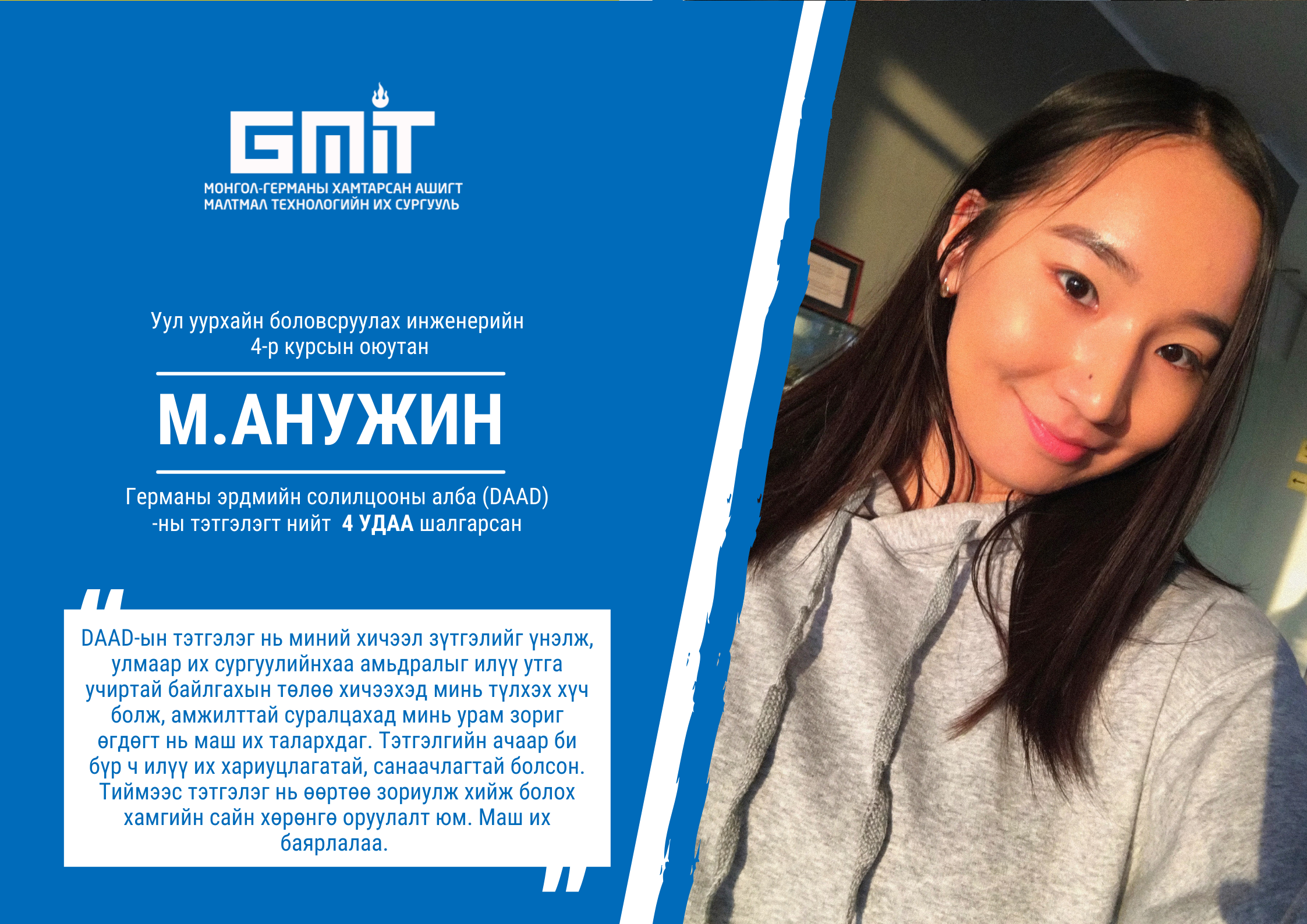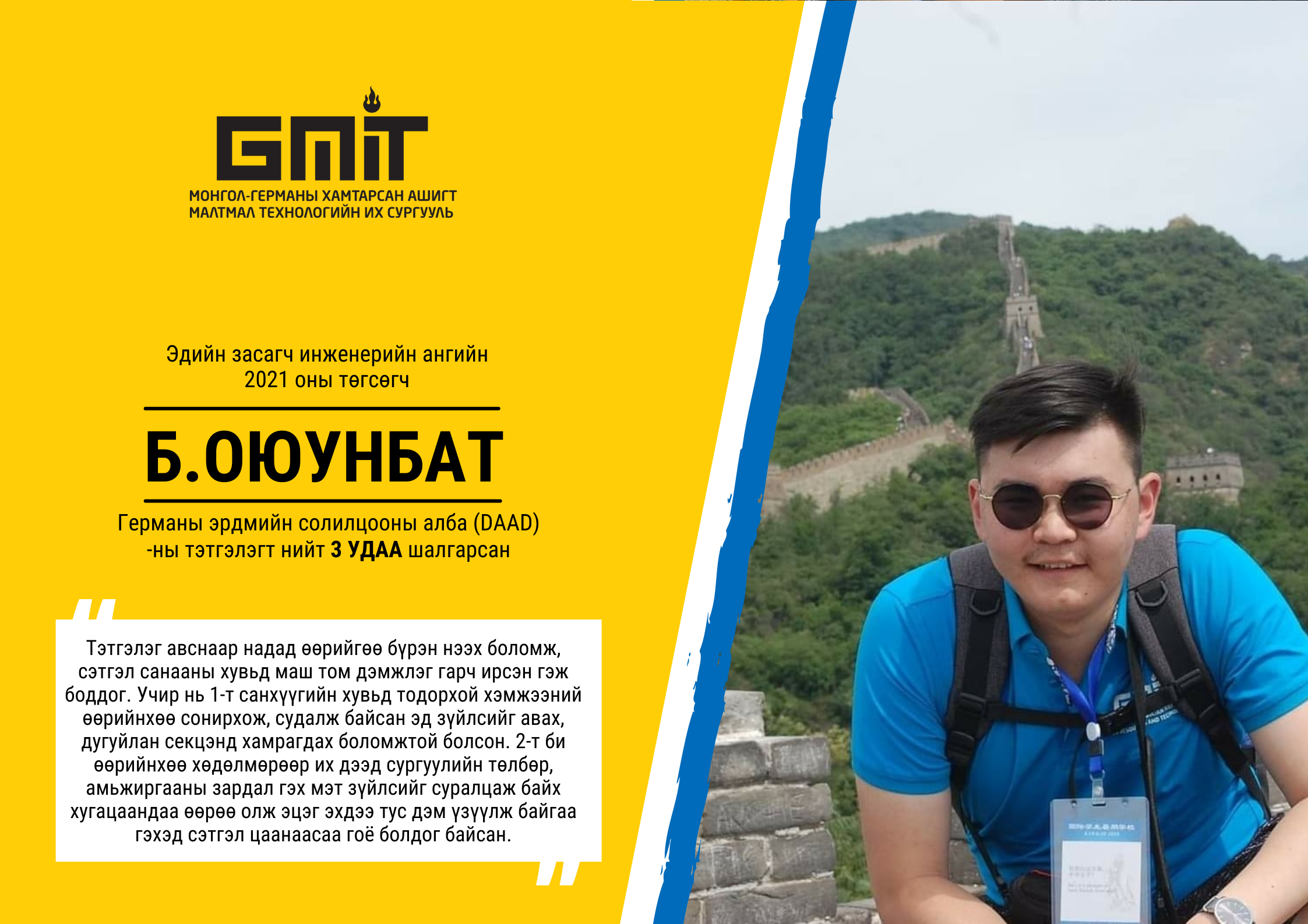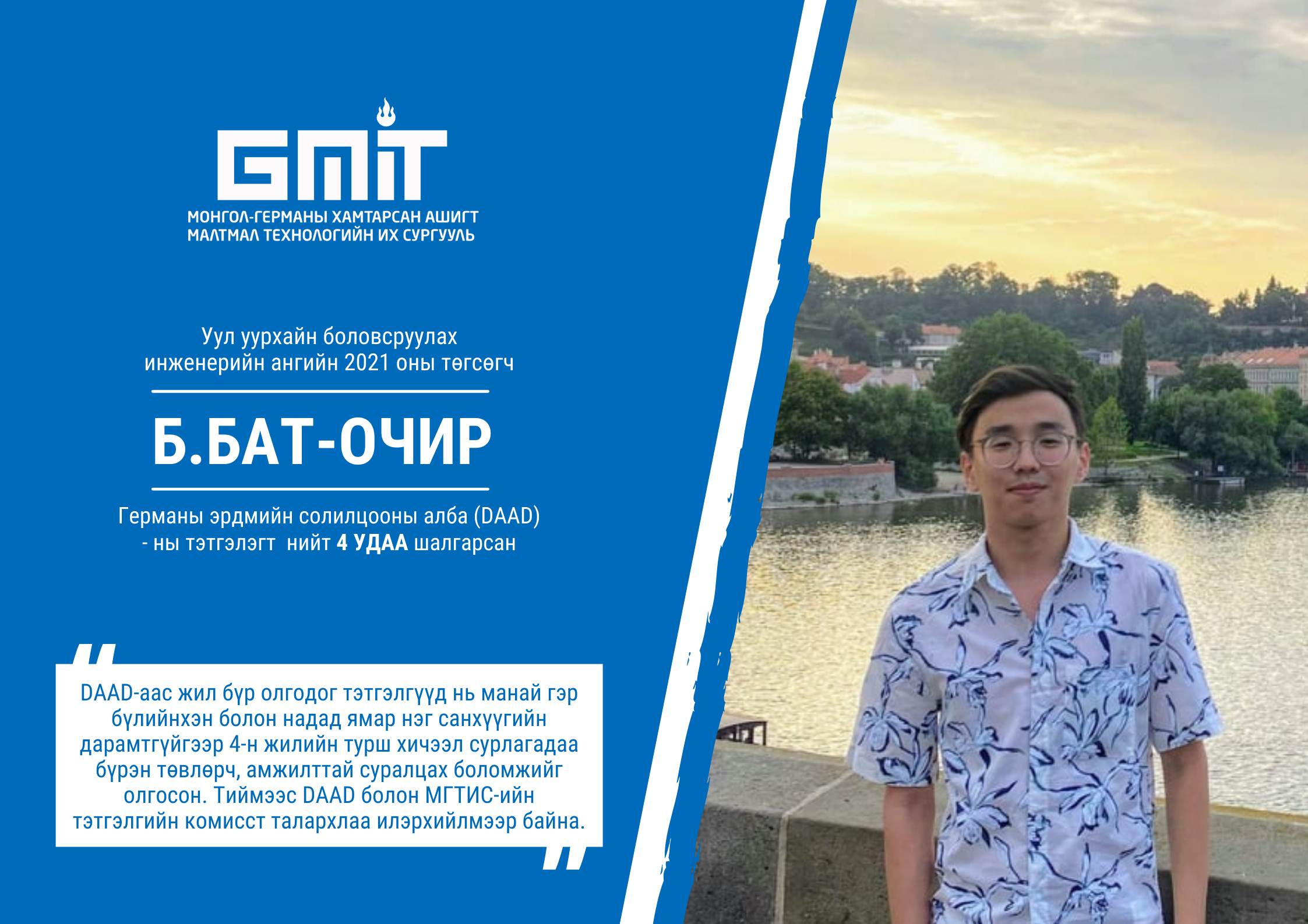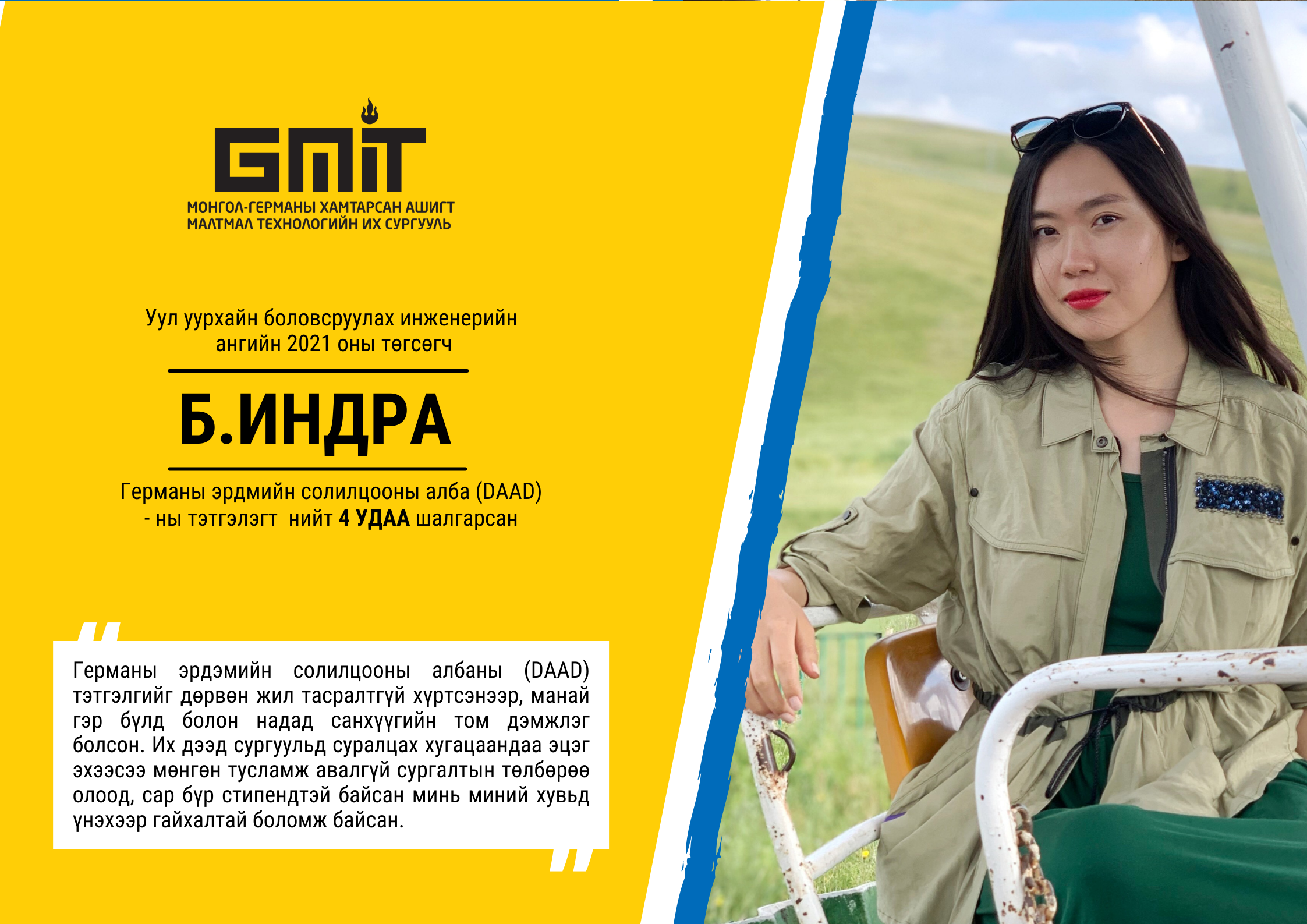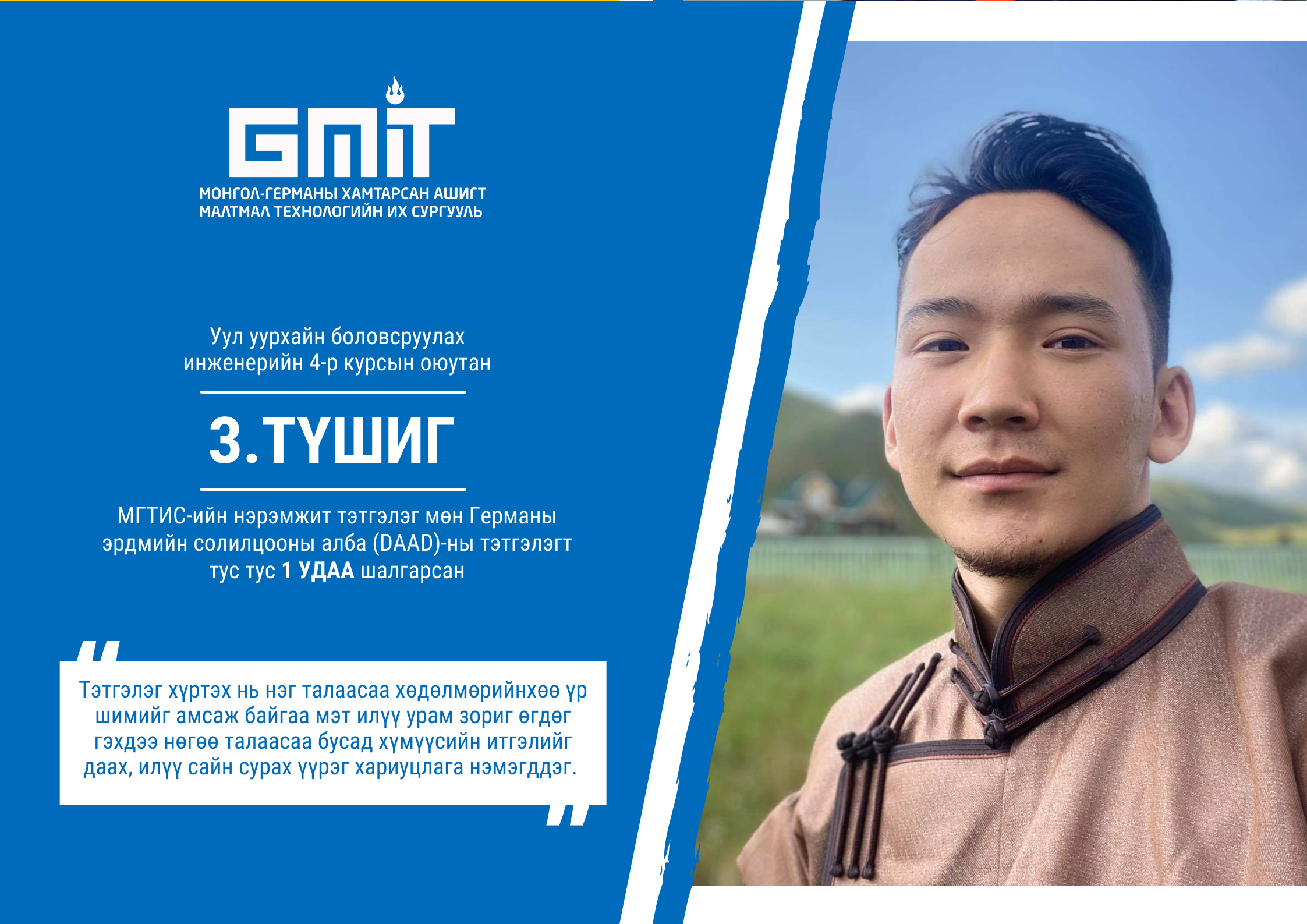 МГТИС-ийн эдгээр тэтгэлгүүдийг хүртсэн оюутнуудын сэтгэгдлийг зургаар хуваалцаж байна. Танд ч мөн МГТИС-ийн тэтгэлгээр амжилттай суралцаж байгаа ГУРВАН ОЮУТАН ТУТМЫН НЭГ нь байх боломж бий. Та эх орондоо тэтгэлэгтэйгээр суралцаж, дэлхийн түвшний инженерүүдийн нэг болохыг хүсвэл яг одоо Элсэлтийн цахим бүртгэлд амжиж бүртгүүлээрэй.