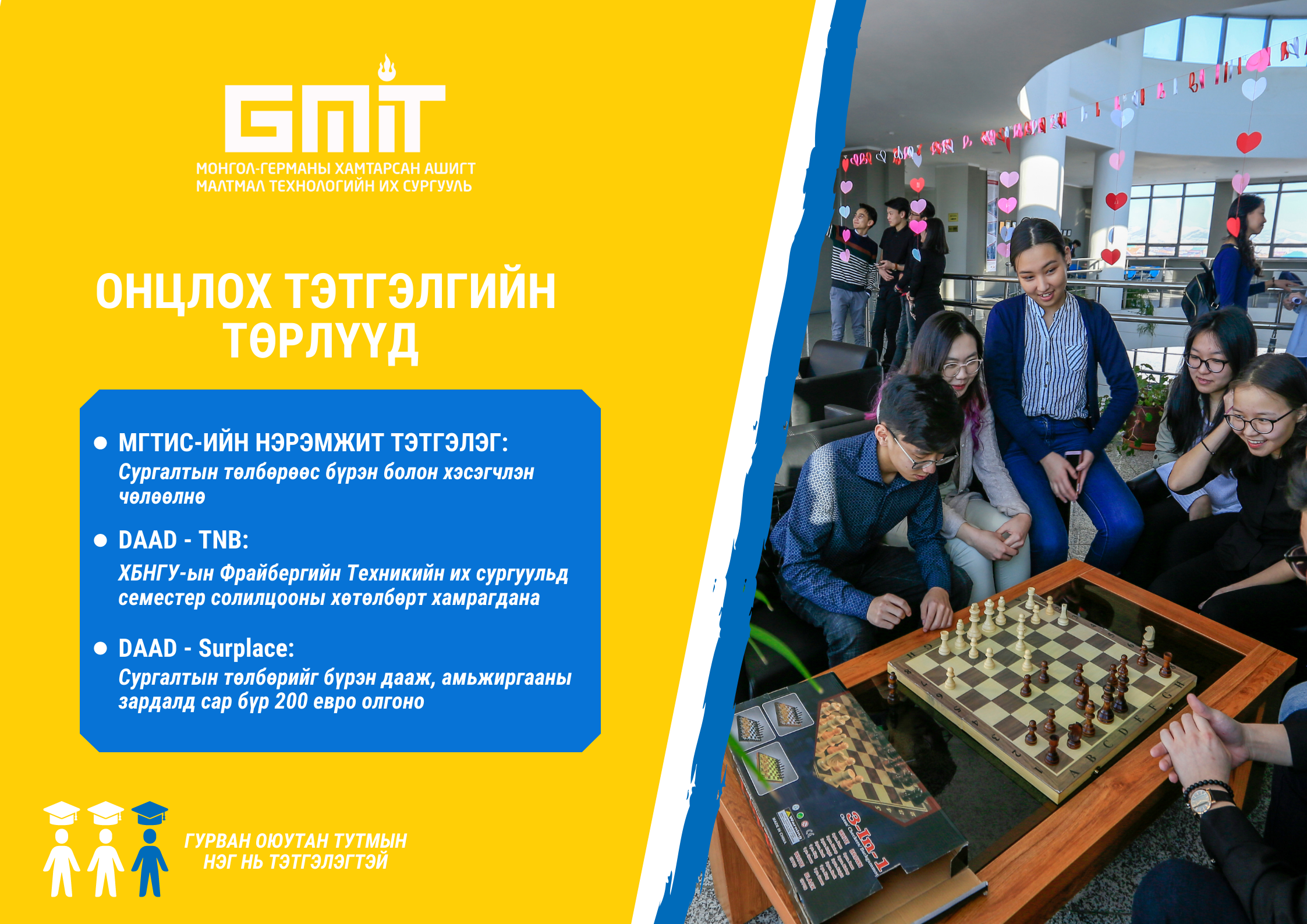 Монгол-Германы хамтарсан ашигт малтмал, технологийн их сургууль (МГТИС) нь 2013 онд үүсгэн байгуулагдсан цагаасаа 2020 он хүртэл оюутнууддаа нийт 2.6 тэрбум төгрөгийн гурван төрлийн тэтгэлгийг олгосон байна. Жил бүр нийт оюутны 20 орчим хувь нь Германы эрдмийн солилцооны алба (DAAD)-ны тэтгэлэг, 20 орчим хувь нь Монгол Улсын Засгийн газрын санхүүжилттэй МГТИС-ийн нэрэмжит тэтгэлгийг хүртдэг.