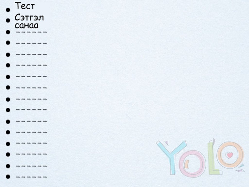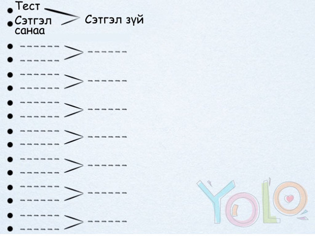 2. Дараагааар нь толгойдоо орж ирсэн үгсээ доош жагсаан бич. Ингэхдээ тэдгээр үгэнд хязгаар тавьж хэт цэгнэх хэрэггүй. Толгойд орж ирсэн үгсээ бичээд бай.