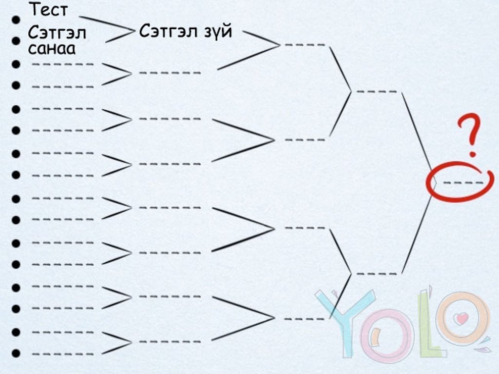 3. Дараагаар эхний хоёр үгийг утгын хувьд холбож байгаа нэг үгийг ард нь бич. Жишээ нь “сургууль, багш” гэж бичсэн байвал “хичээл” гэж холбох нь эсвэл “тест, сэтгэл санаа” гэсэн бол “сэтгэл зүй” гэж холбох нь байна. Гэх мэт утгын хувьд холбож байгаа нэг үгийг бичээрэй.