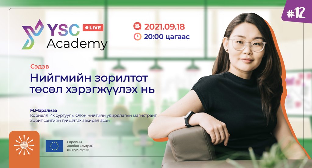 Тэгвэл энэ удаагийн YSC цуврал лекцээр Корнелл Их сургуулийн Олон нийтийн удирдлагын магистрант, Зориг сангийн гүйцэтгэх захирал асан М.Маралмаа оролцож, “Нийгмийн зорилтот төсөл хэрэгжүүлэх нь” сэдвийн дор өөрийн арвин туршлага, нөр их хөдөлмөрөөр олж авсан мэдлэгээ бид бүхэнд хуваалцах гэж байна.