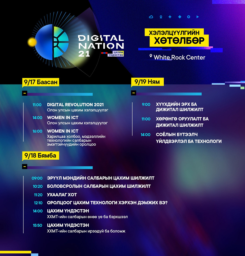 Мөн энэ жил Монгол Улсад орчин цагийн харилцаа холбооны салбар үүсэж, хөгжсөний 100 жилийн ой тохиож байгаагаараа онцлог. Энэ ч утгаараа “Digital Nation – 2021” цахим шилжилтэд түүчээлэх үндэсний арга хэмжээний үеэр салбарын өнгөрсөн, одоо, ирээдүйг хэлэлцэх, цаашид өсөн нэмэгдэх мэдээллийн технологийн салбарын ач холбогдол, бусад салбаруудтай уялдаа холбоог нягтруулах бодлогын хэлэлцүүлэг, форум зохион байгуулагдах юм.