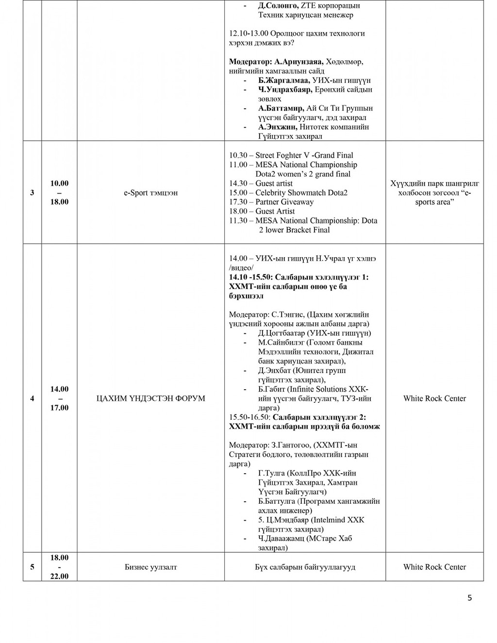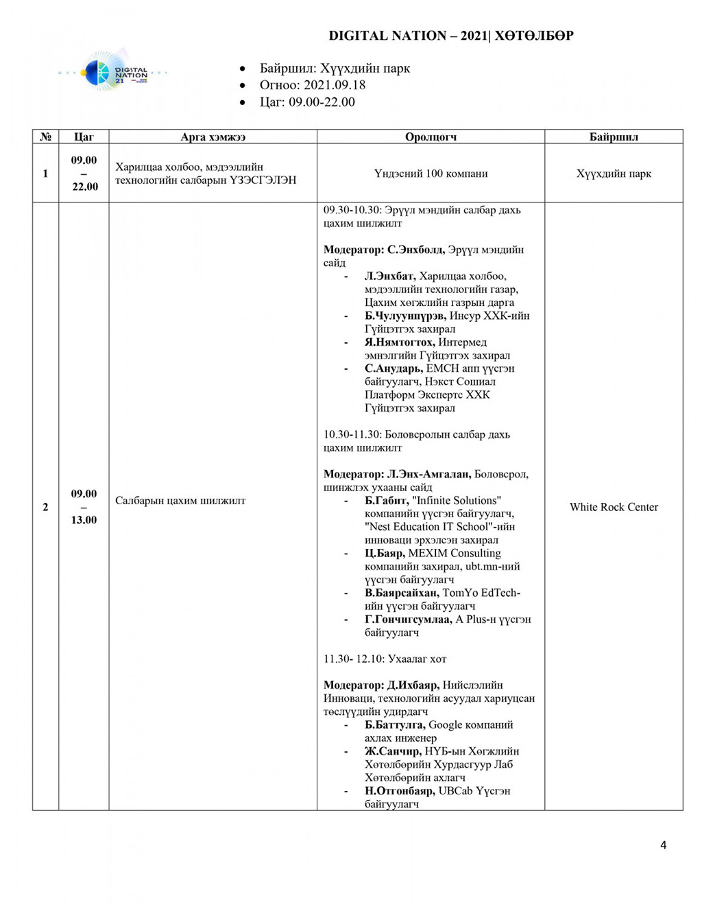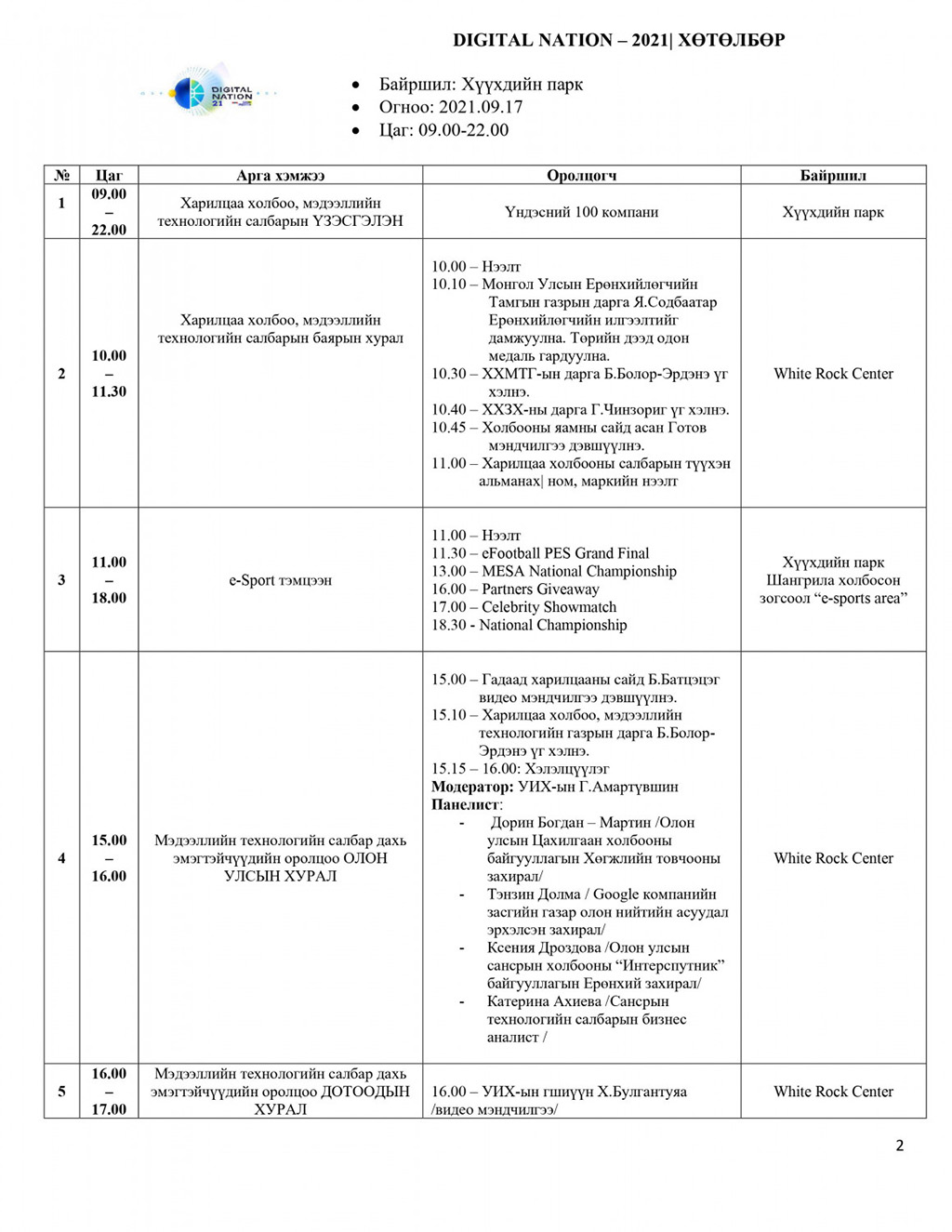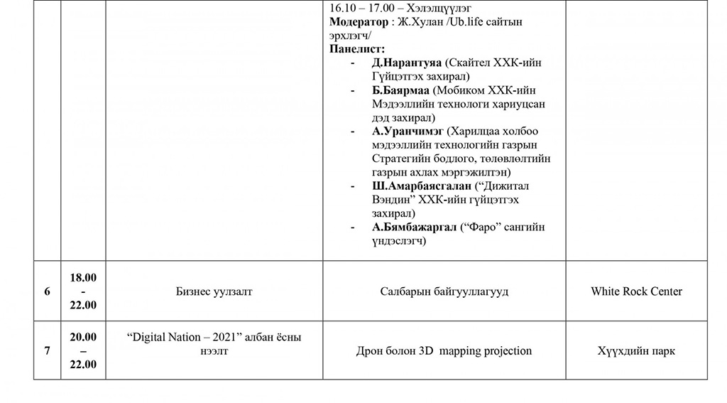 Нийслэл Улаанбаатар хотын төвд, Хүүхдийн паркт гурван өдрийн турш үргэлжлэх арга хэмжээний үеэр Дрон болон Гэрлийн үзүүлбэр, “e-Mongolia”-гийн шинэчилсэн хувилбарыг танилцуулахын зэрэгцээ 5G сүлжээнд шилжих, олон нийтэд танилцуулах арга хэмжээ болно. Түүнчлэн цахим спорт, соёл урлагийн хэсэг зэрэг олон нийтийг хамарсан өргөн хэмжээний үйл ажиллагаа болох гэж байна.