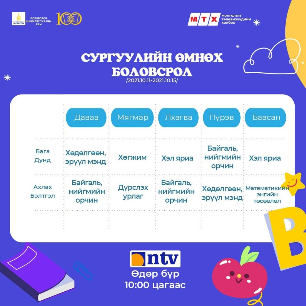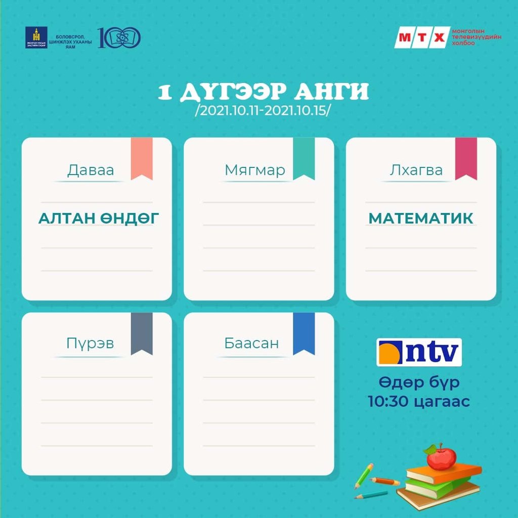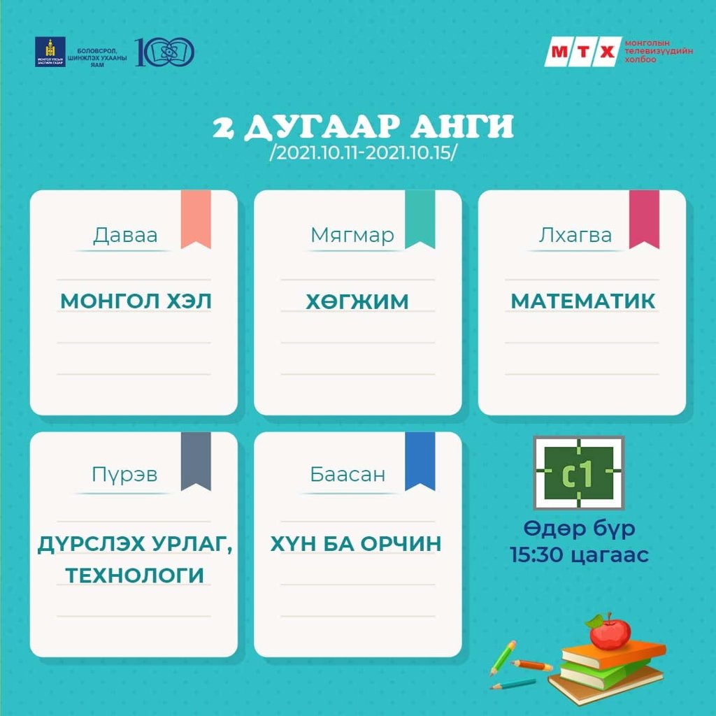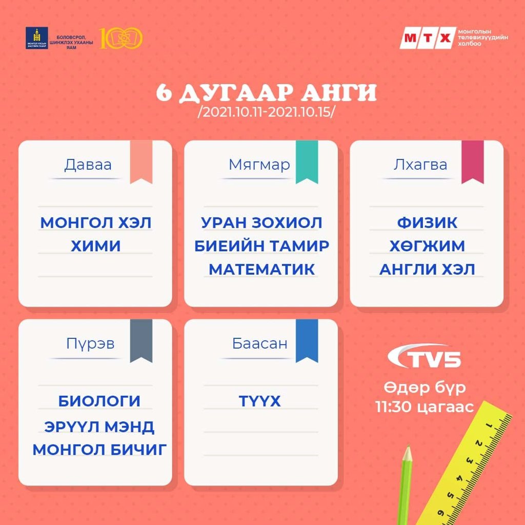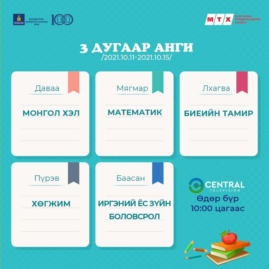 Ковид-19 цар тахлын улмаас хичээл сургалтын үйл ажиллагаа танхимын хэлбэрт бүрэн шилжээгүй байгаатай холбогдуулан сурагчид хичээлээ бататгах зорилгоор теле хичээлийг үзэх боломжтой.