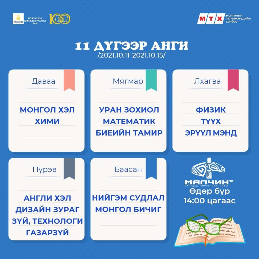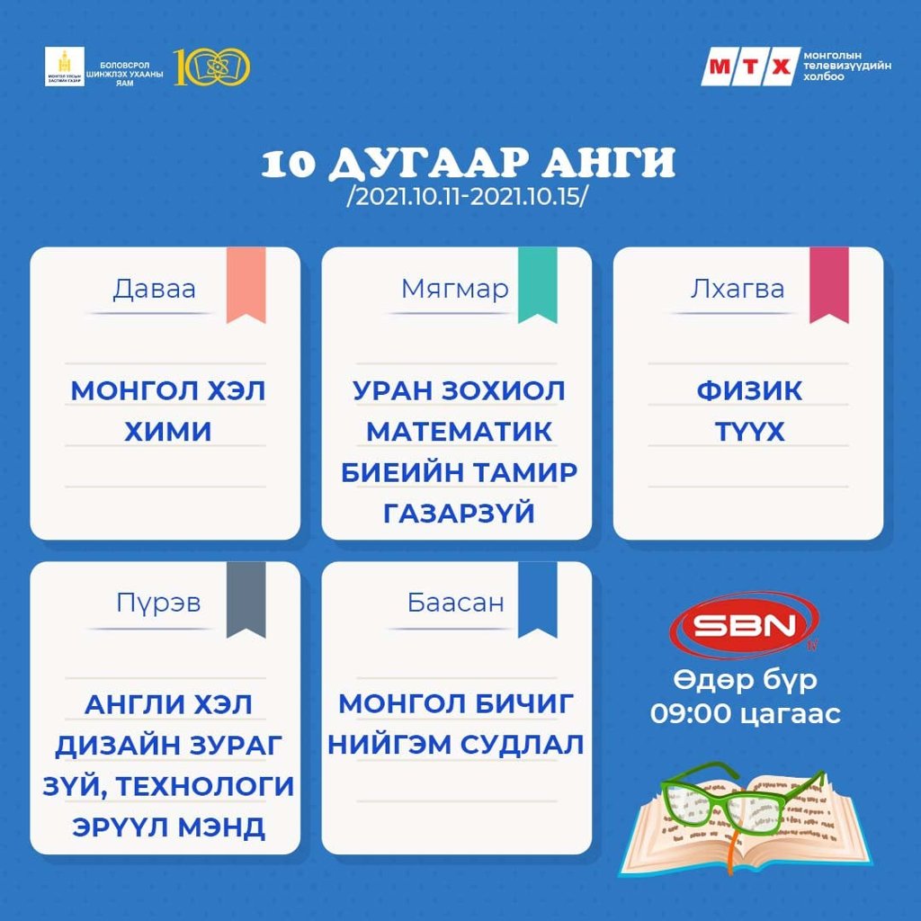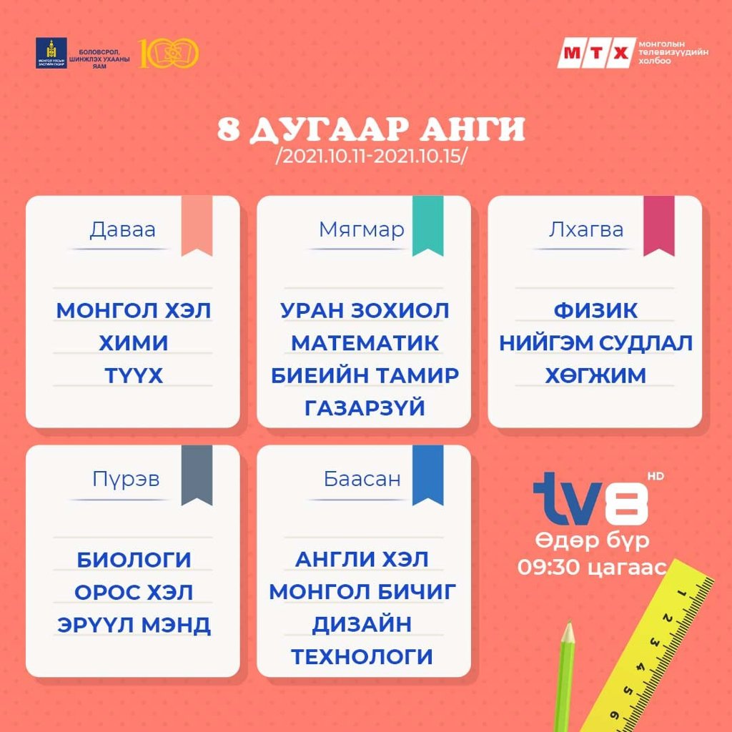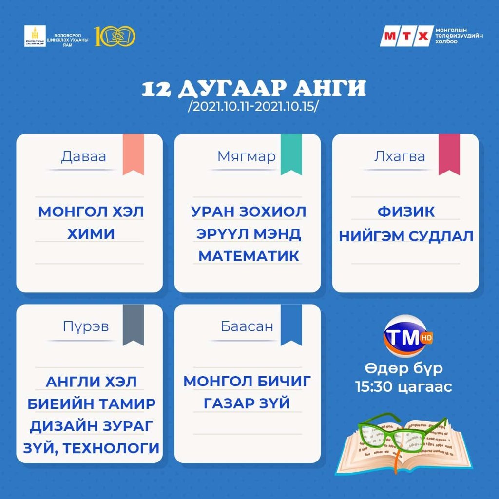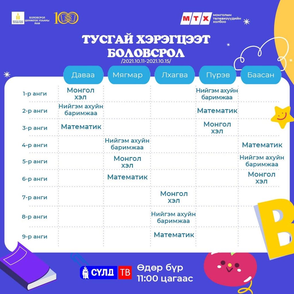 Ковид-19 цар тахлын улмаас хичээл сургалтын үйл ажиллагаа танхимын хэлбэрт бүрэн шилжээгүй байгаатай холбогдуулан сурагчид хичээлээ бататгах зорилгоор теле хичээлийг үзэх боломжтой.