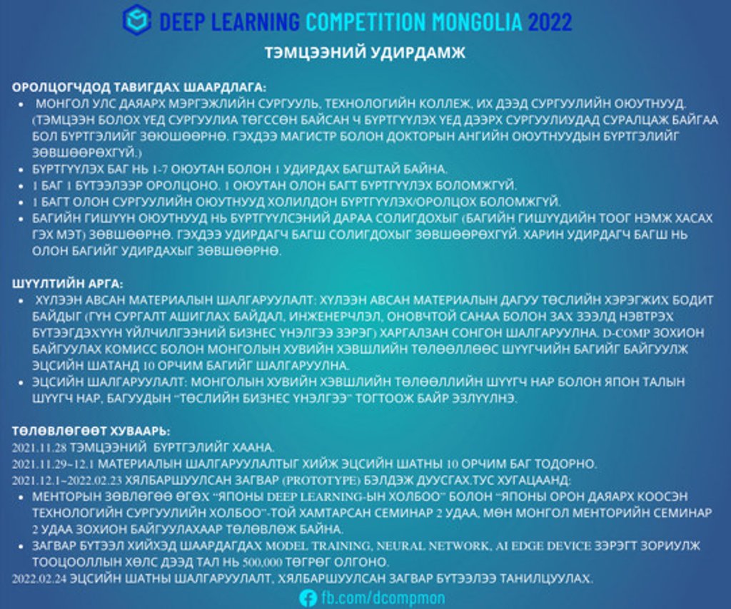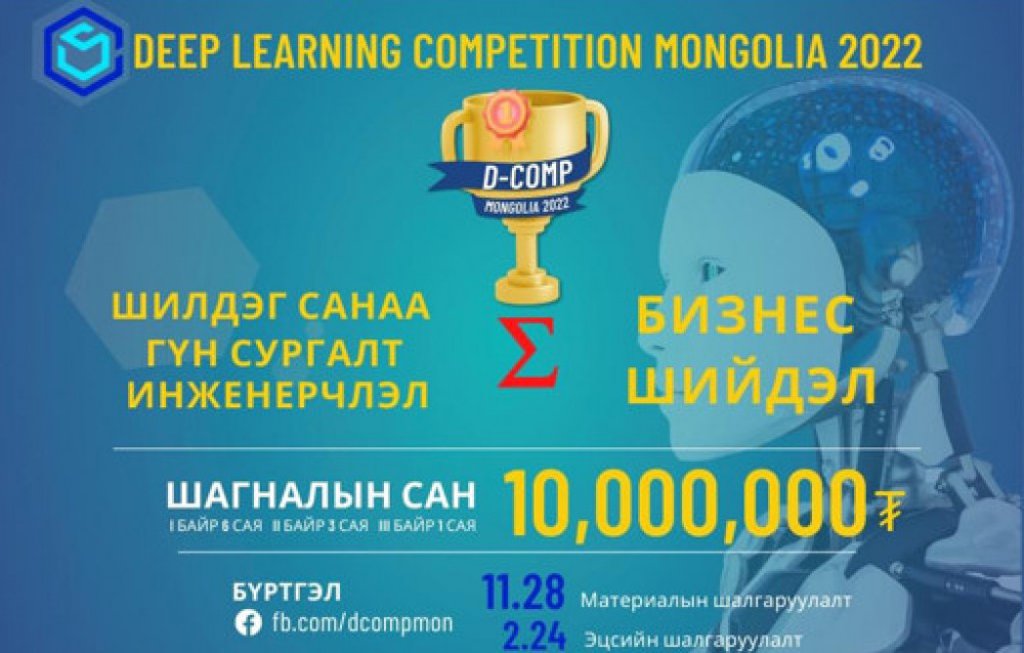 Deep Learning Competition Mongolia 2022 тэмцээн нь “Бүтээх эрдмийн технологи” болон “Deep Learning”-ыг ашиглан бүтээл (хялбаршуулсан загвар) зохион бүтээж, эдгээр бүтээлээс бий болсон “бизнесийн чадавхи”- г компанийн үнэлгээ болгон үнэлүүлж, өрсөлдөх уралдаан юм.