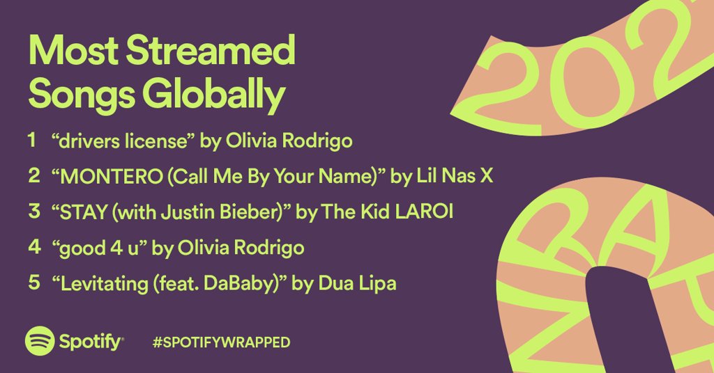 Харин энэ онд хүмүүсийн хамгийн их сонссон уран бүтээлээр залуу дуучин Olivia Rodrigo-гийн "drivers license" дуу тодорсон аж. Түүний “good 4 u” дуу мөн жагсаалтын дөрөвдүгээр байранд бичигдэж байна.
