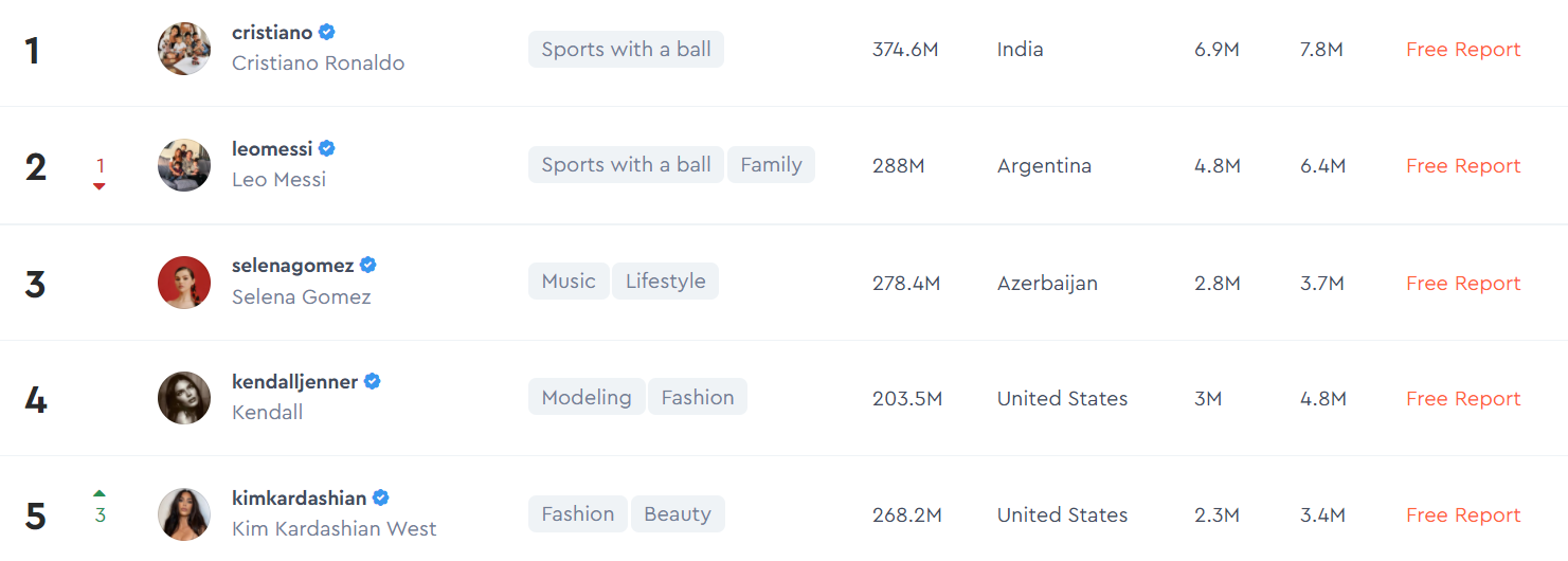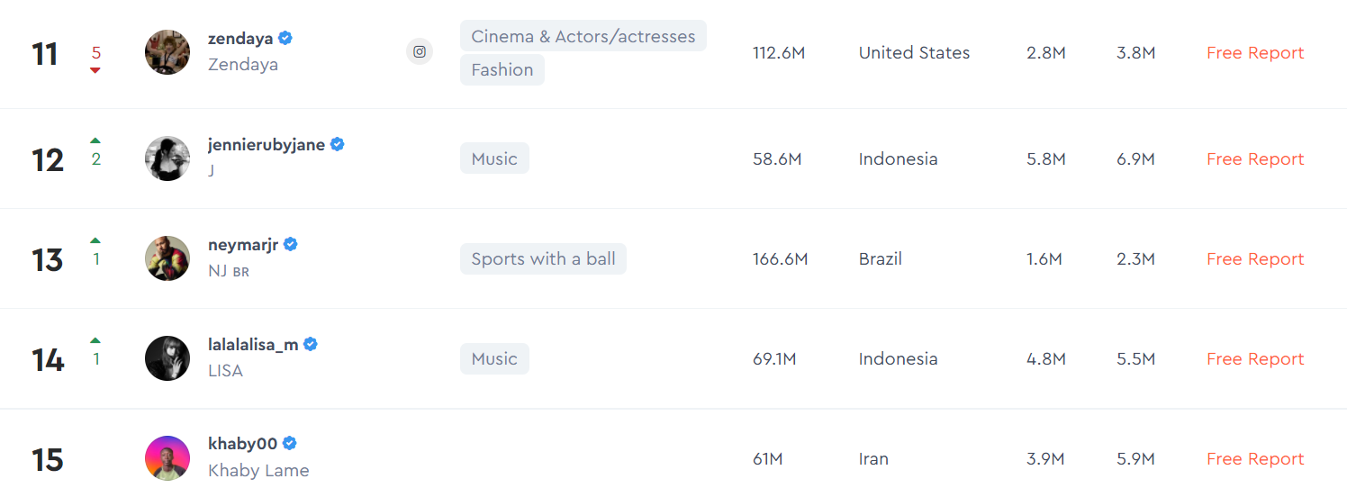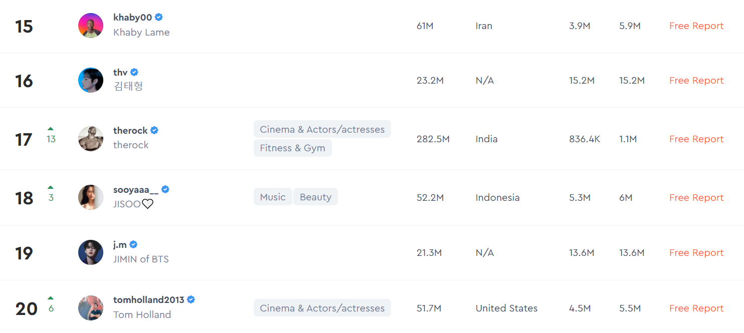 “Hype Auditors” нь хиймэл оюун ухааны тусламжтайгаар Инстаграм дээрх нөлөөлөгчдийн бүртгэл баттай эсэхийг тодорхойлох үйлчилгээ үзүүлэгч платформ юм. Ийнхүү тэд 2021 оны хамгийн нөлөө бүхий 1000 алдартныг танилцуулснаас эхний 20 байрт шалгарсан нөлөөлөгчдийг дурдвал: