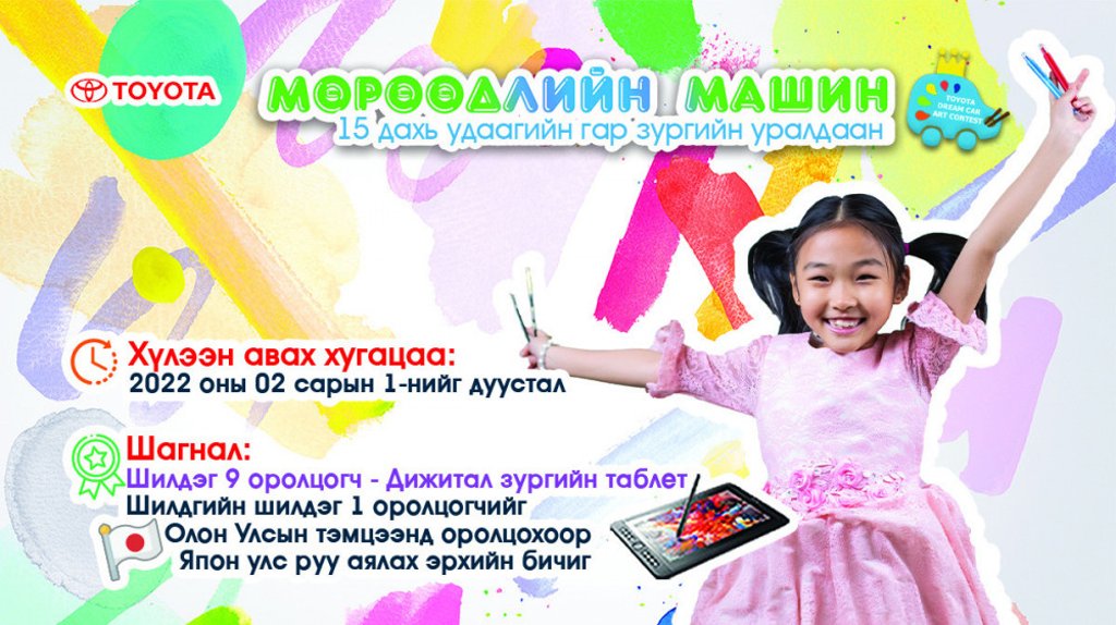 Үндэсний ялагч болж, Монголынхоо нэрээр олон улсын хүүхдүүдийн бүтээлүүдтэй өрсөлдөх боломжийг олгох 15 дахь удаагийн “Мөрөөдлийн машин” гар зургийн уралдаанд оролцогчдын бүтээлийг 2022 оны хоёрдугаар сарын 1-н хүртэл хүлээн авах юм.