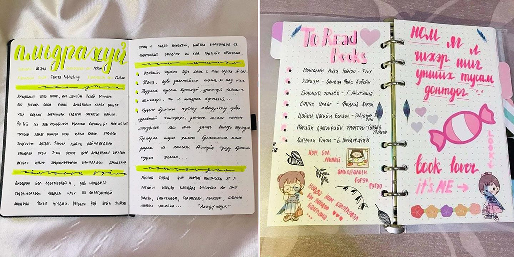 Уншсан номоосоо ойлгосон зүйл, таалагдсан дүр, эшлэл гэх мэт зүйлсээ номын тэмдэглэлдээ буулгадаг.