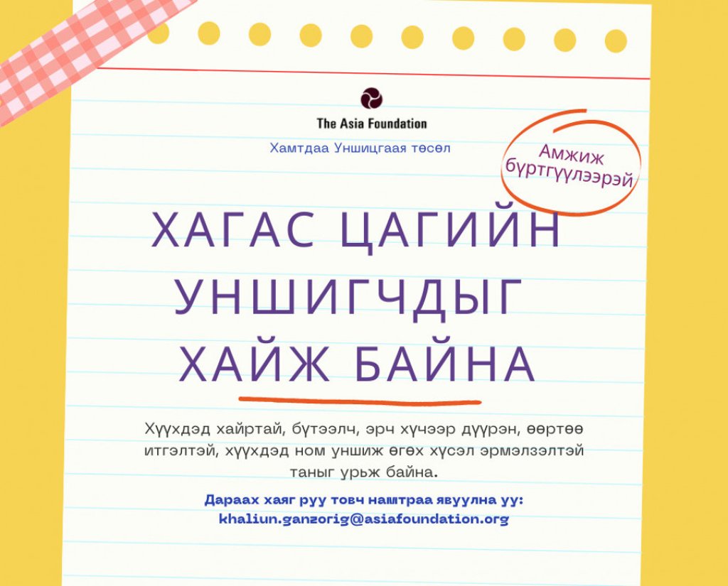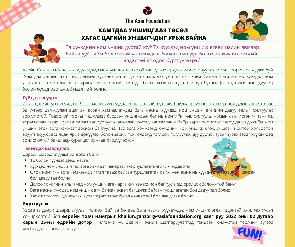 Хэрэв та дээрх шаардлагуудыг хангаж байгаа бөгөөд бага насны хүүхдүүдэд ном уншиж өгөх, тэдэнтэй ажиллах хүсэл сонирхолтой бол өөрийн товч намтрыг khaliun.ganzorig@asiafoundation.org хаяг руу энэ сарын 25-ны өдрийн дотор илгээнэ үү.