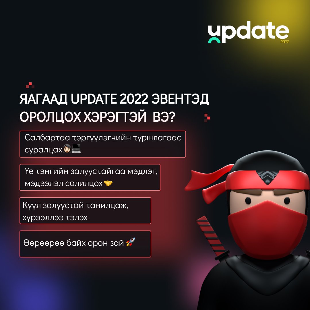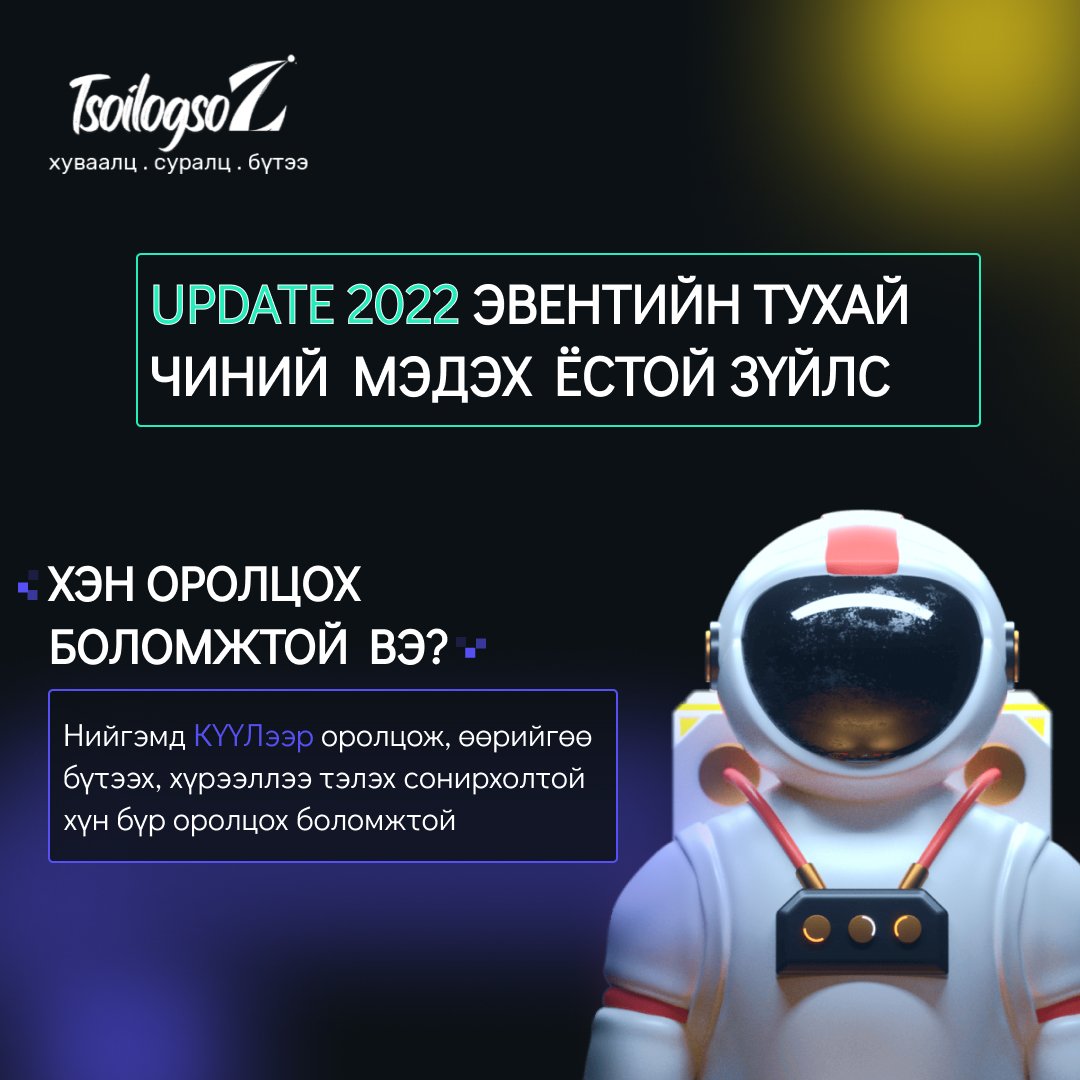 ЦойлогсоZ төсөл болон Лантуун Дохио ТББ хамтран шинэ үеийн залуусын хандлага, сэтгэлгээ, ур чадвар, арга барил, нийгмийн күүл оролцоог тодорхойлохоор #BebetterDobetter уриан дор "Update 2022" эвентийг зохион байгуулах гэж байна. Хэрэв чи бусдаас суралцаж, хөгжиж дэвшиж, олон "чанартай юм" буу халж, үе тэнгийн залуустайгаа хамт нэгэн оройг өнгөрүүлэхийг хүсвэл наашаа суугаарай.