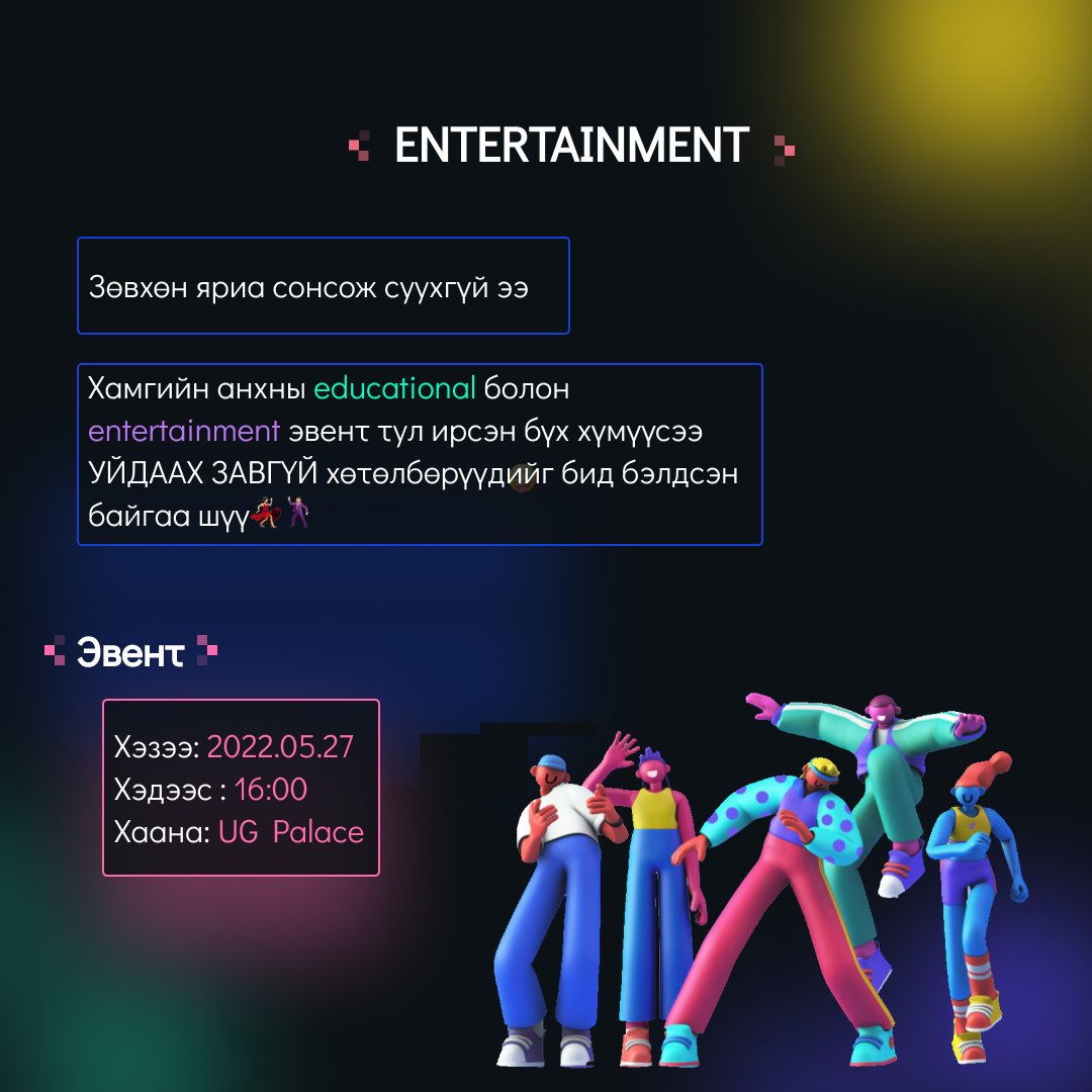 Энэхүү эвент нь залууст нийгмийн күүл оролцоог таниулах, шинэ соёлыг түгээх, цаашлаад хөгжилд чиглэсэн томоохон бүтээн байгуулалт өөрсдийн гараар бүтээх, экосистемийг бүрдүүлэх дуу хоолойг нэгтгэхээр хийгдэж буй залуусын анхны EDUTAINMENT эвентийг тавдугаар сарын 27-нд зохион байгуулах гэж байна.