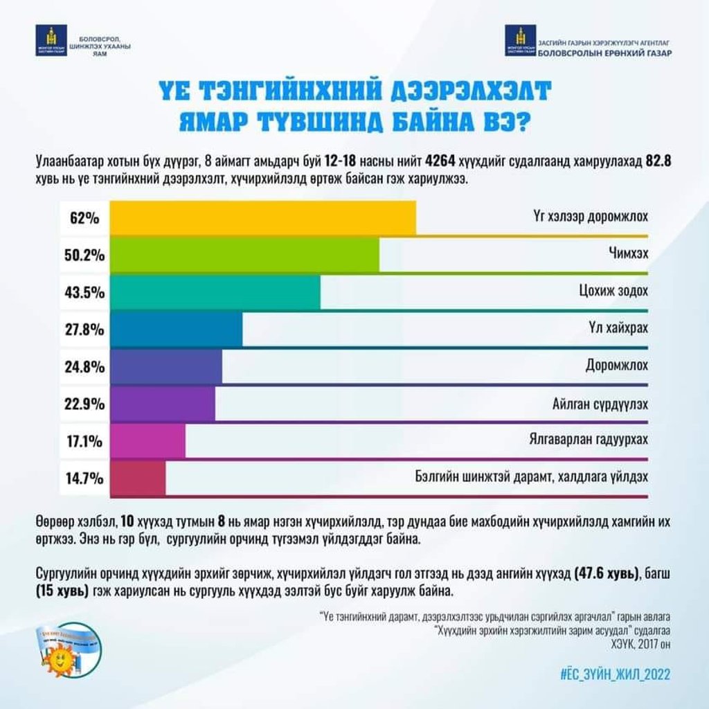 Улаанбаатар хотын бүх дүүрэг, найман аймагт амьдарч буй 12-18 насны нийт 4264 хүүхдийг судалгаанд хамруулахад 82.8 хувь нь үе тэнгийн дээрэлхэлт, хүчирхийлэлд өртөж байсан гэж хариулжээ.
