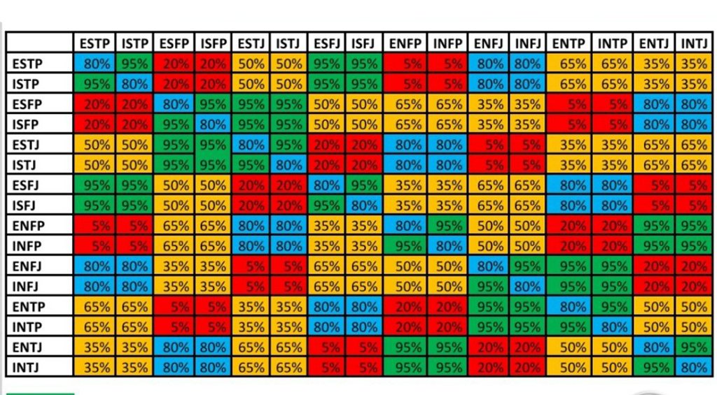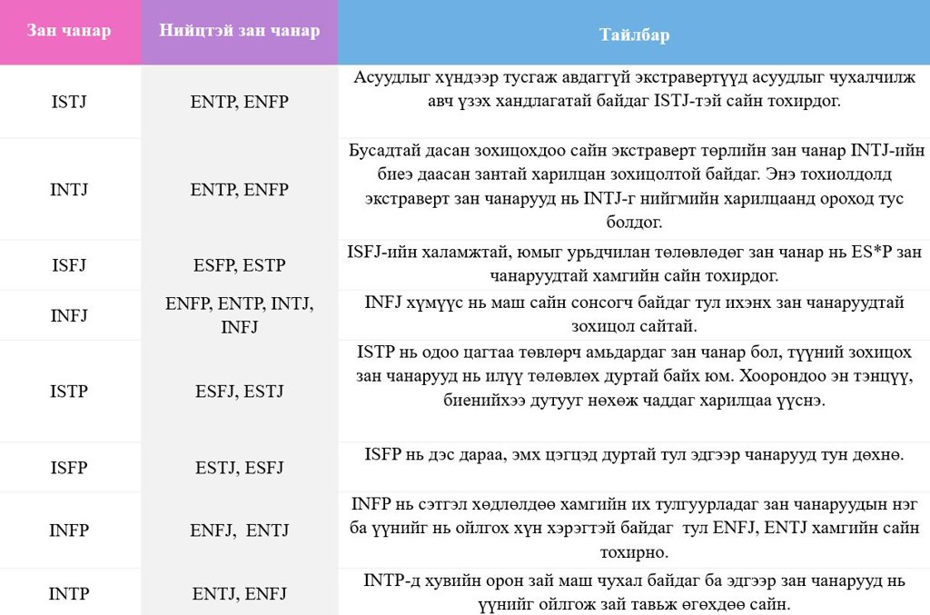 Бид Myers-Briggs Type Indicator тестийн тусламжтайгаар өөрийн зан чанарын хэлбэрийг тодорхойлсон. Харин одоо таны зан чанар эргэн тойрны хүмүүсийнхтэй хэр сайн зохицдогийг олж мэдэцгээе. Та, таны найзууд, хайртай хүн чинь ямар төрлийн интроверт, экстраверт вэ? Тантай хэр нийцтэй байдаг бол?