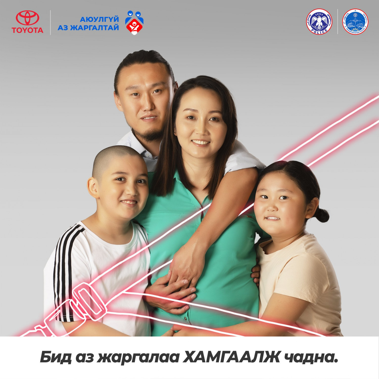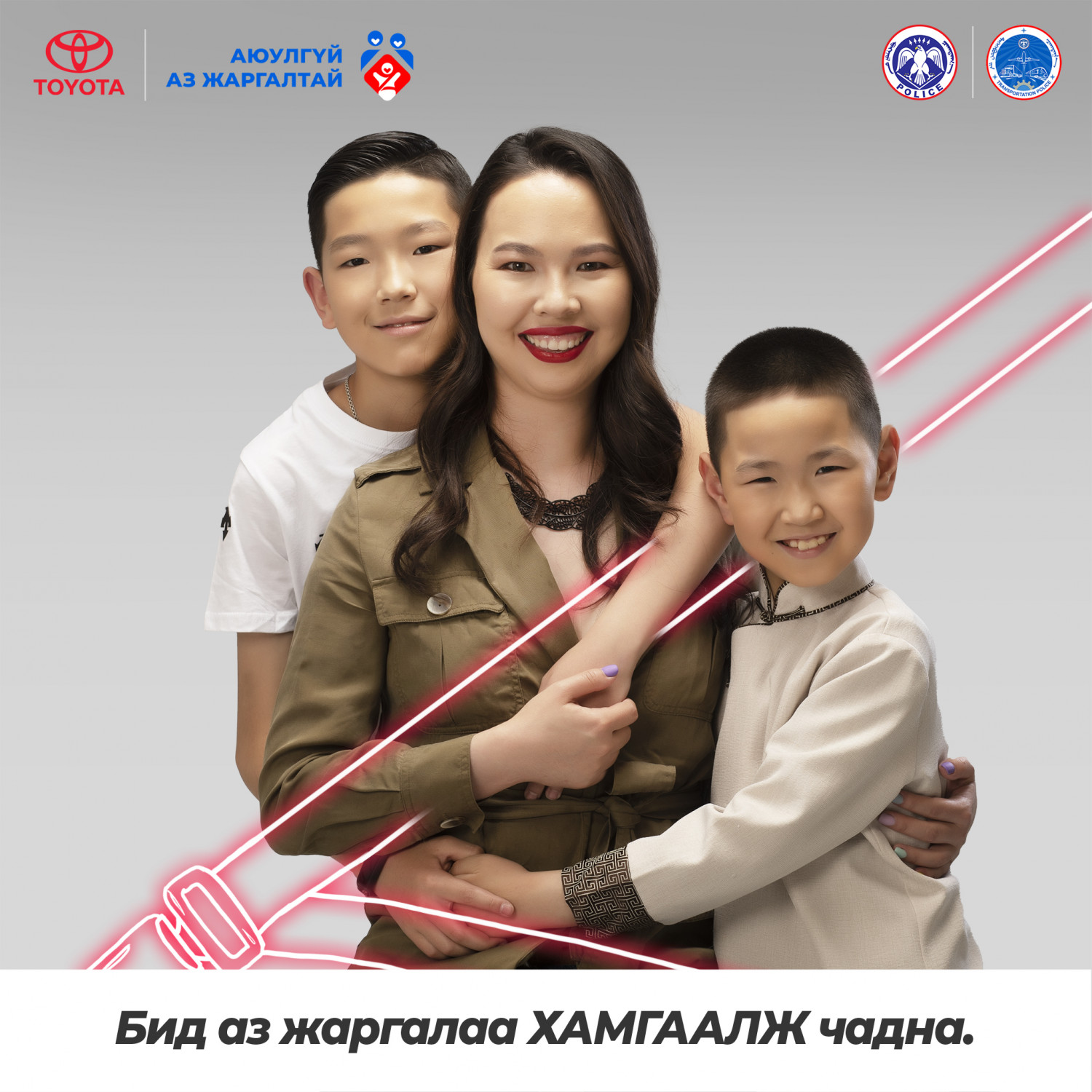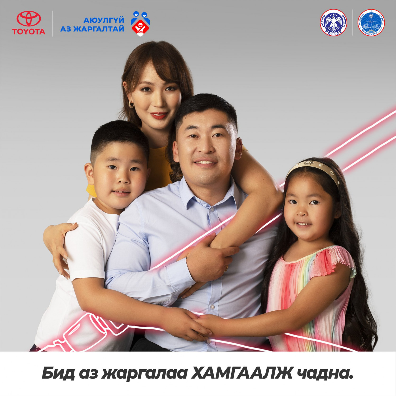 Хайртай хүүхдүүдийнхээ инээдийг харж, ханийнхаа халамжийг мэдрэх үедээ бид аз жаргалаар дүүрдэг. Эрүүл энх, тэдэнтэйгээ хамт байхдаа л үүнийг мэдэрдэг. Тэдний тэврэлт бол аз жаргал бас хамгаалалт юм. Болзошгүй аюулаас сэргийлж, суудлын бүсээ бүслээрэй. Бид аз жаргалаа ХАМГААЛЖ чадна.