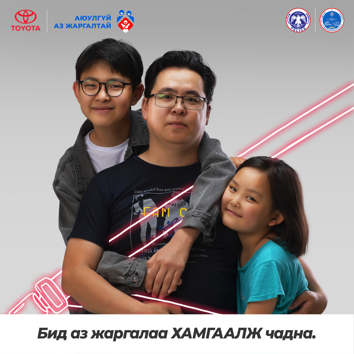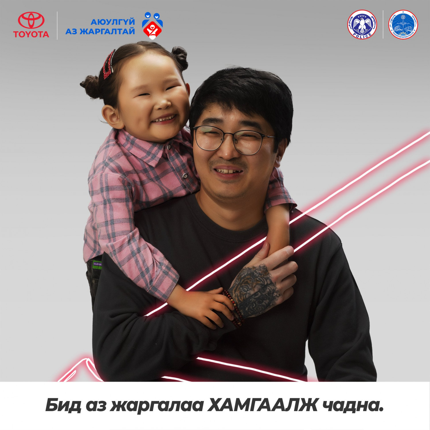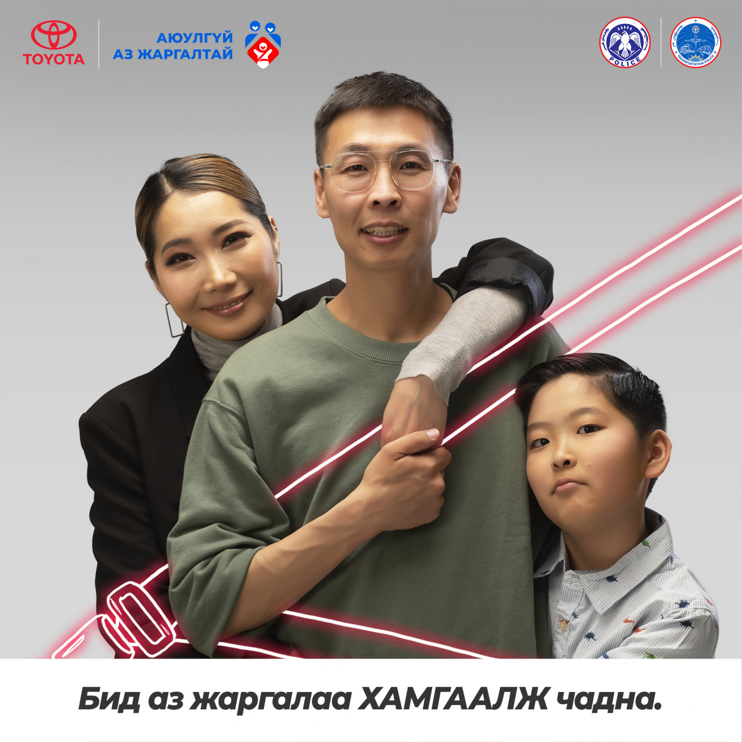 Хайртай хүүхдүүдийнхээ инээдийг харж, ханийнхаа халамжийг мэдрэх үедээ бид аз жаргалаар дүүрдэг. Эрүүл энх, тэдэнтэйгээ хамт байхдаа л үүнийг мэдэрдэг. Тэдний тэврэлт бол аз жаргал бас хамгаалалт юм. Болзошгүй аюулаас сэргийлж, суудлын бүсээ бүслээрэй. Бид аз жаргалаа ХАМГААЛЖ чадна.