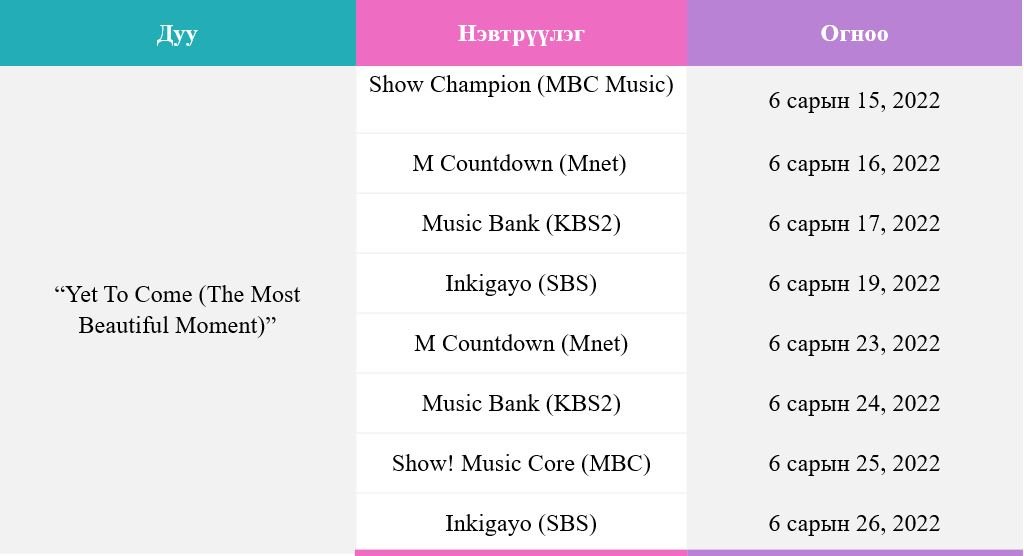 2022 оны зургаадугаар сарын 9-ний өдөр олон нийтэд цацагдсан “Proof” album-ийн title track дуу болох “Yet To Come (The Most Beautiful Moment)”-ийн клипт BTS-ийн бусад дуунд гардаг дүрслэлүүд олон байсныг анзаарсан байх. Тэдгээр төстэй зүйлсийг дууны зарим хэсгийг дахин сануулахаар бүтээжээ. Хувцаслалтууд ч нөлөөлж байсан гэдэгтэй маргахгүй биз.