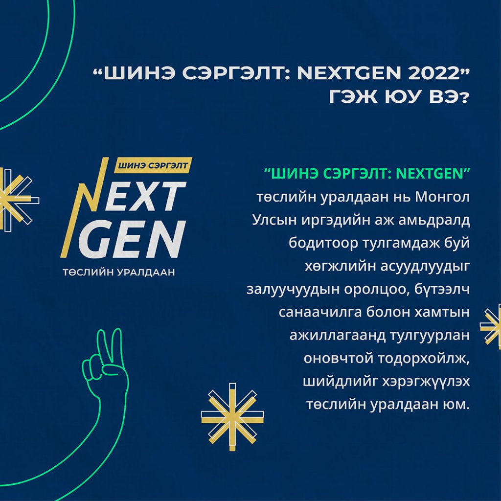 Энэхүү төсөл нь Монгол Улсын иргэдийн аж амьдралд бодитоор тулгамдаж буй хөгжлийн асуудлуудыг залуучуудын оролцоо, бүтээлч санаачилга болон хамтын ажиллагаанд тулгуурлан оновчтой тодорхойлж, шийдлийг хэрэгжүүлэх төслийн уралдаан юм. Шалгарсан төслүүдэд 20 хүртэлх сая төгрөгийн санхүүжилт олгогдохоороо онцлог юм.