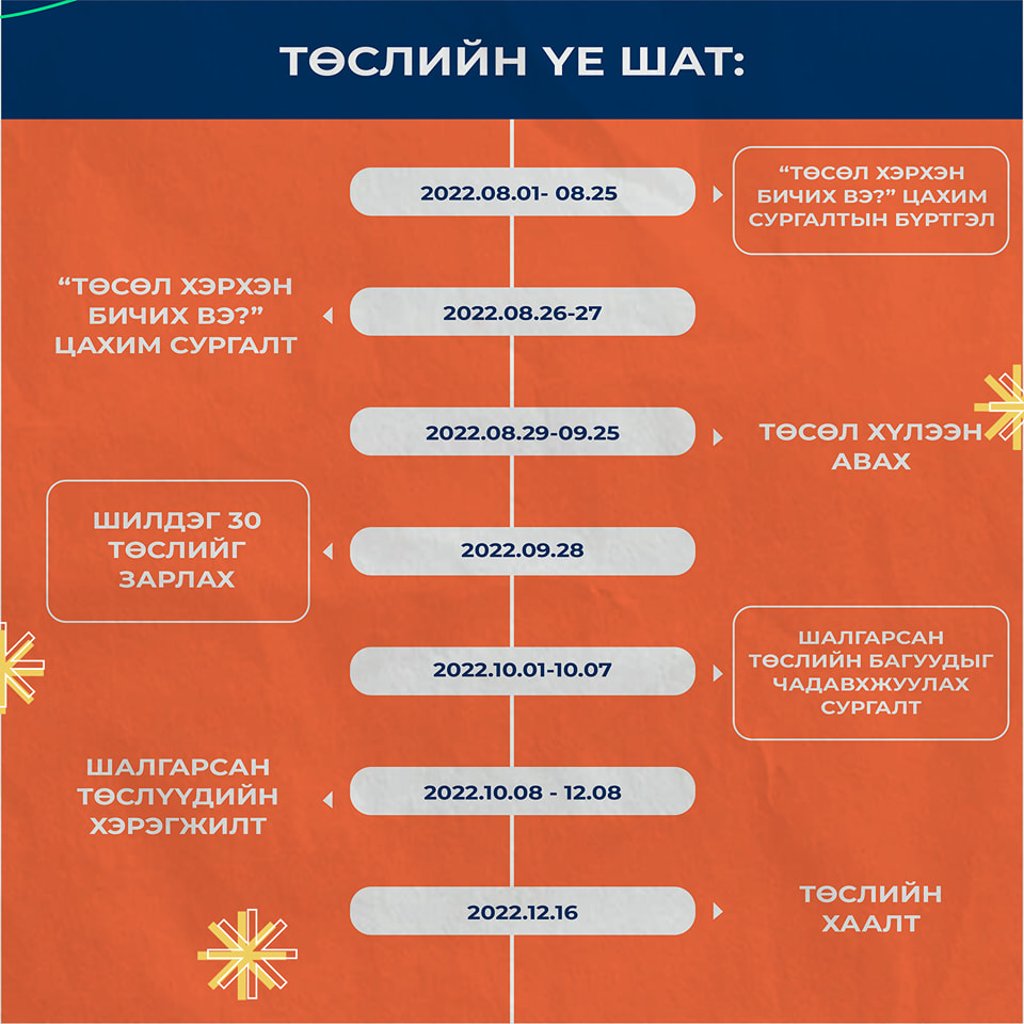 Төсөл нь нийт 5 үе шаттай ба дэлгэрэнгүй мэдээлэл болон “Төсөл хэрхэн бичих вэ? Цахим сургалт”-ын бүртгэлд хамрагдах бол ЭНД дарна уу.