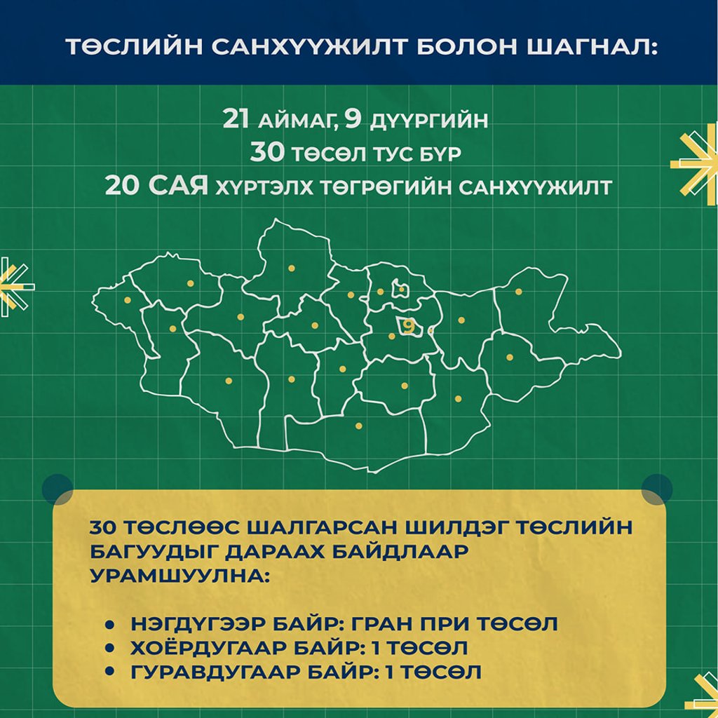 Шалгарсан 30 төсөл тус бүрт 20,000,000₮ хүртэлх санхүүжилт олгоно. Төсөл хэрэгжүүлэгч нь нэмэлт санхүүжилтийг бүрдүүлж болно.