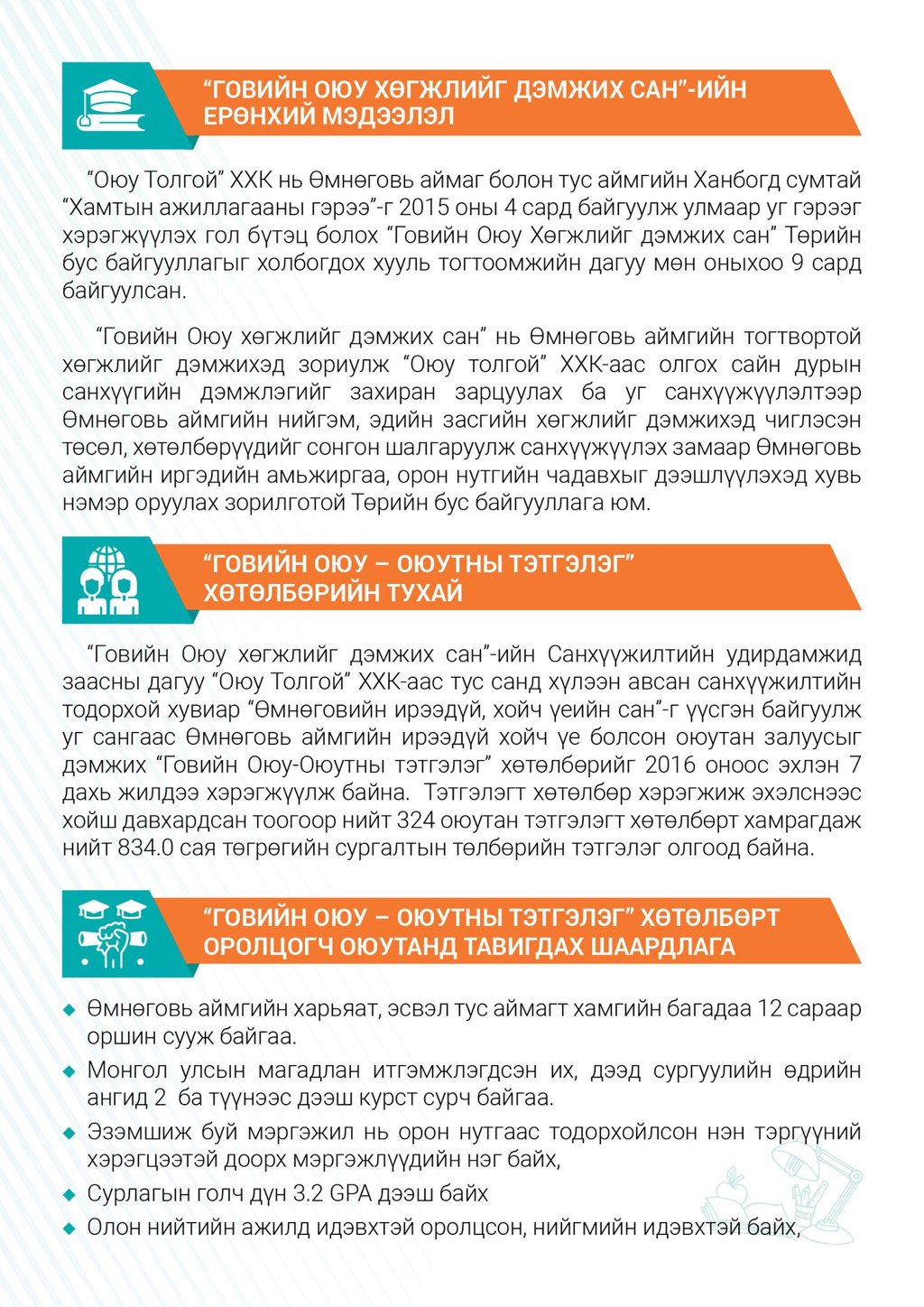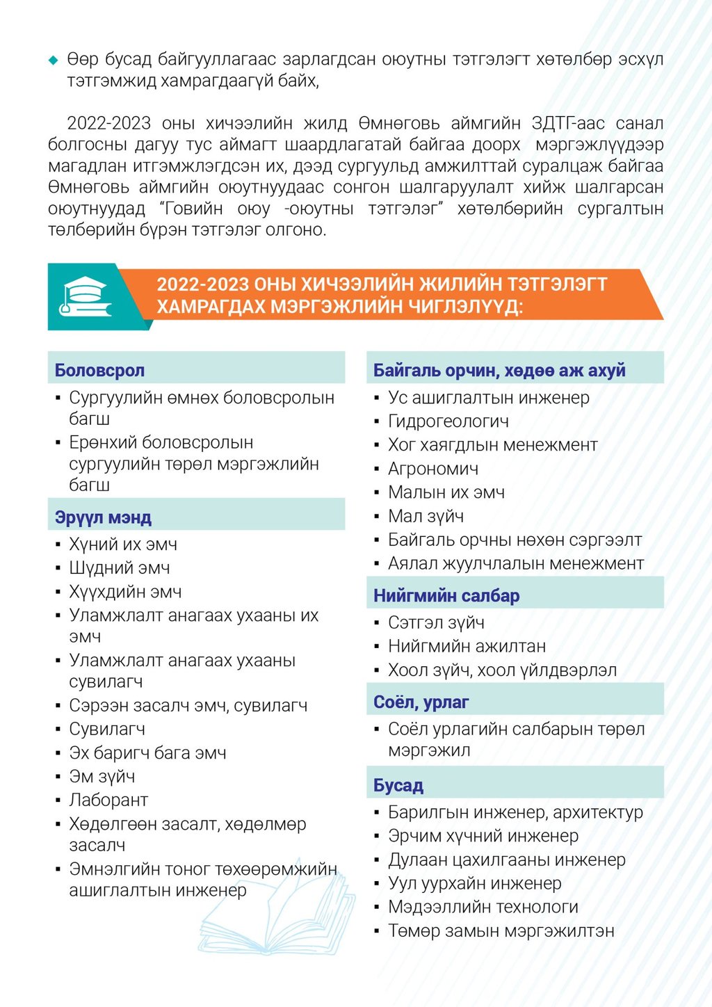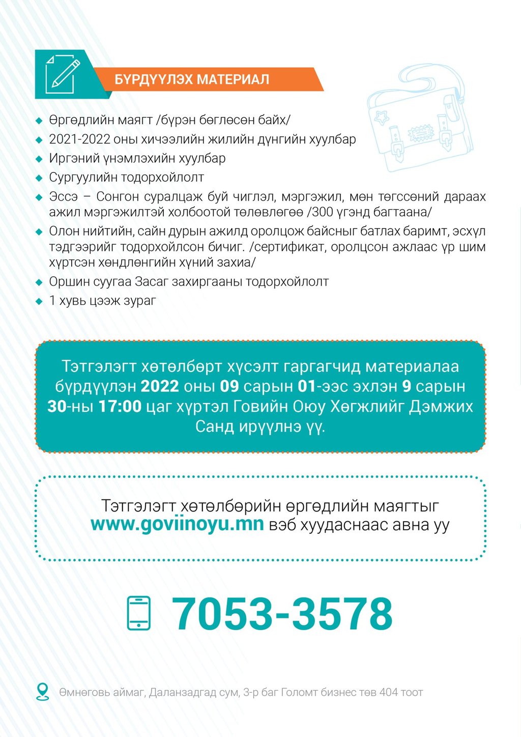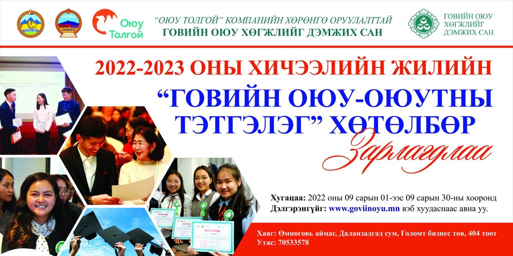2022-2023 оны хичээлийн жилийн "Говийн оюу-Оюутны тэтгэлэг" хөтөлбөрийн материалыг есдүгээр сарын 30-ны өдрийн 18:00 цаг хүртэл хүлээн авна.