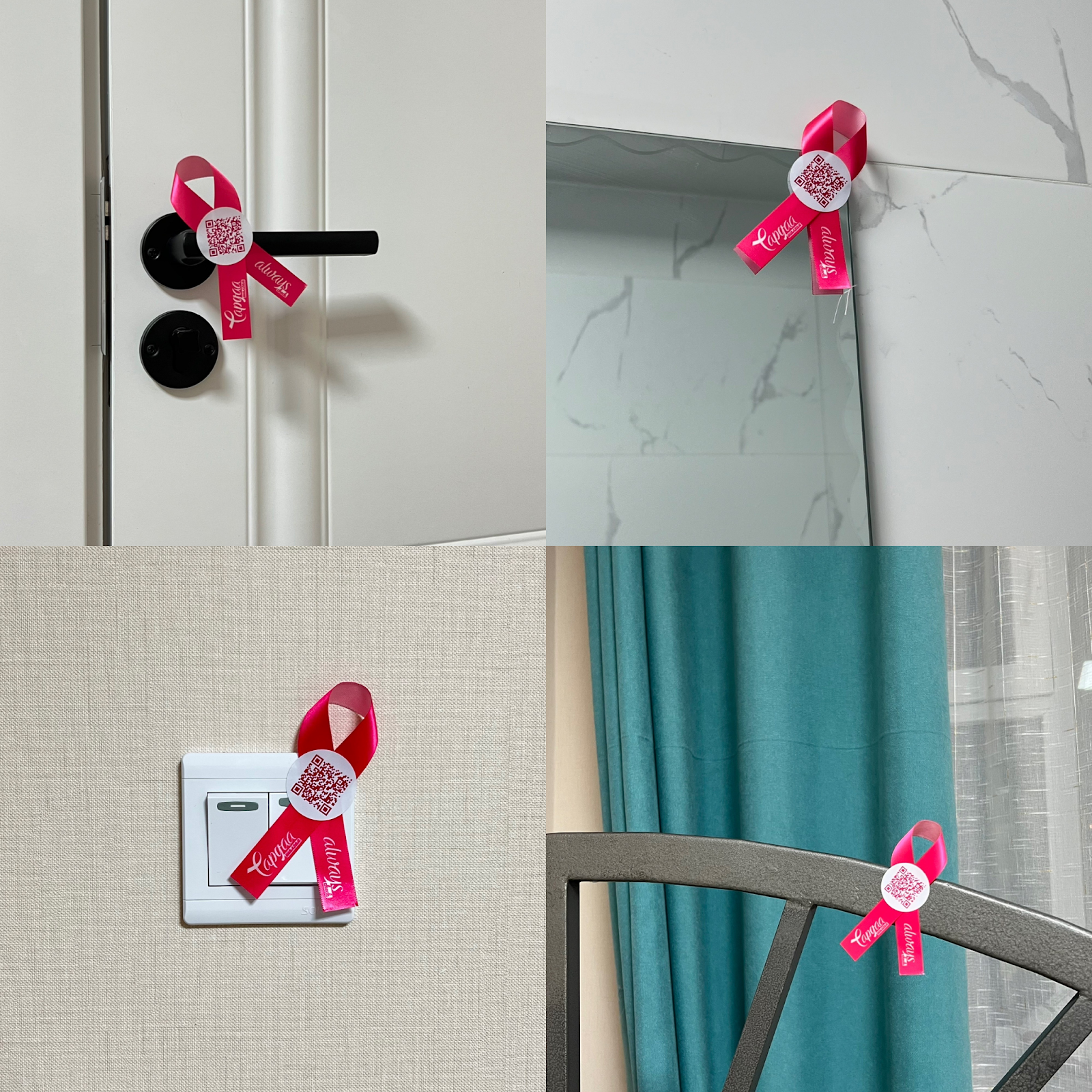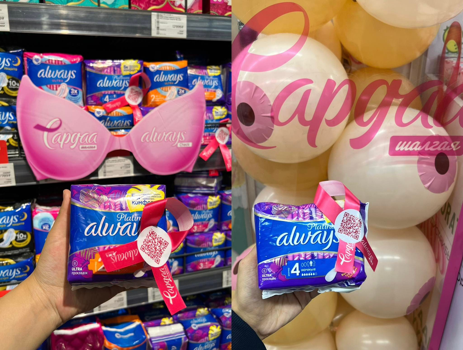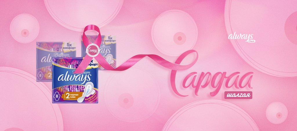 Always-ийн бүтээгдэхүүн дээр байршуулсан ягаан тууз нь хөхний хорт хавдрыг таниулах бэлгэ тэмдэг болдог.