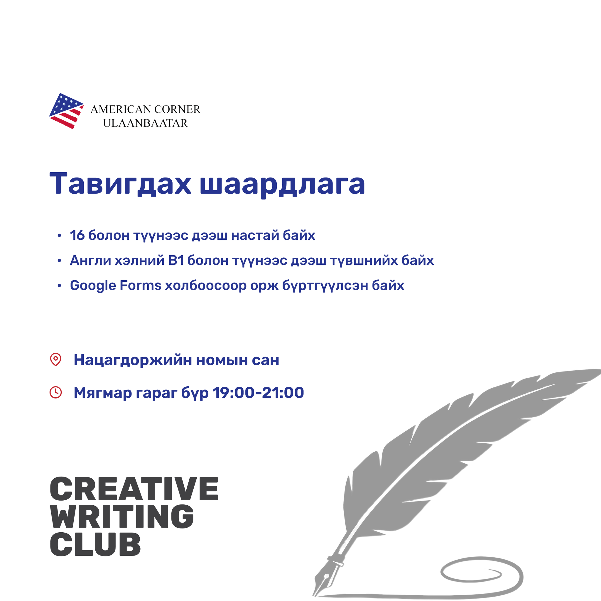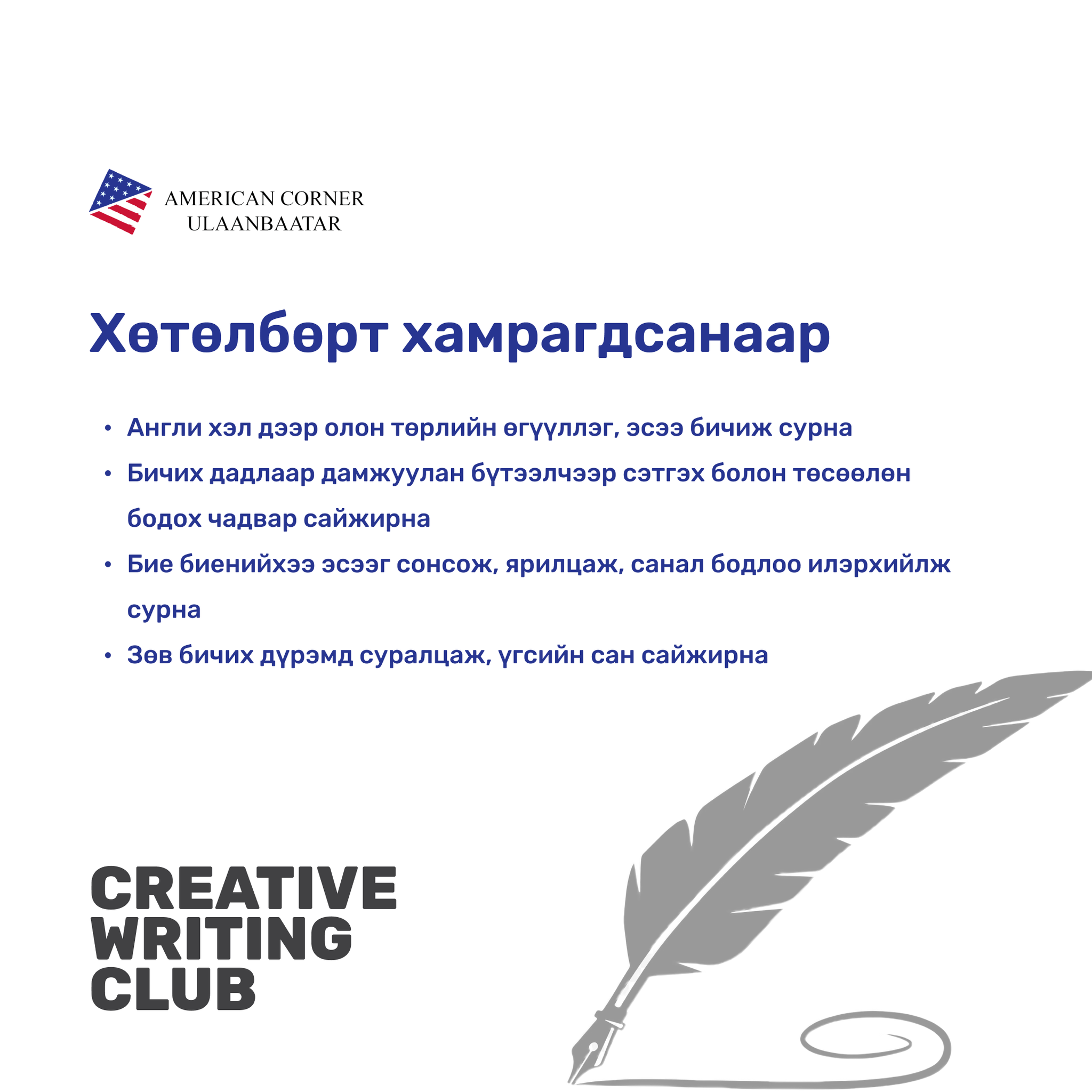 Англи хэл дээр эсээ бичиж сурах хүсэлтэй 16-20 насны хүүхэд, залуусдаа зориулан Америк багштай сургалтын хөтөлбөр эхлэх гэж байна.