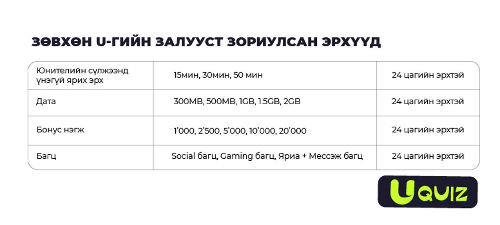Чи өөрийгөө хэр мэдлэгтэй гэж боддог вэ? Ангийн багш “ Цонхон талаасаа А” гэж хэлэхэд ядах зүйлгүй даваад гардаг онц сурлагатан уу? Эсвэл азын тэнгэртээ найддаг мэргэн буудагч уу? Заа яах вэ хэн ч байсан хаяа нэг онгод орох үе хүн бүрд тохиолддог биз. Ямар ч асуултын хариу нүдэнд харагдаад цэцэн үг цээжинд, цэцэг навч ууланд гэсэн шиг хэв нэг өөрийгөө мэдрэх ч сайхан шүү. Тэгвэл U brand-ын U quiz хөтөлбөрт оролцоод үе тэнгийн залуустайгаа цэц булаацалдахад бэлэн үү?