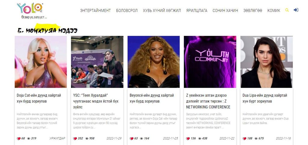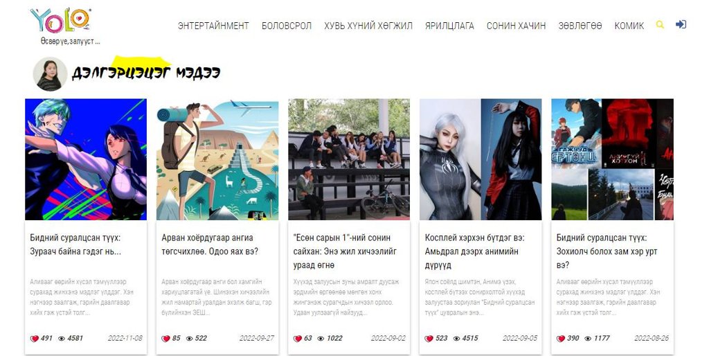 Одоогийн байдлаар Yolo.mn сайтад миний бичсэн найман нийтлэл орсон байна. 2021 оны аравдугаар сарын 21-нд “Сэтгэл зүйн онолын тест: 100 хувь баталгаатай биш” гэх анхны нийтлэл минь сайтад орж байжээ.