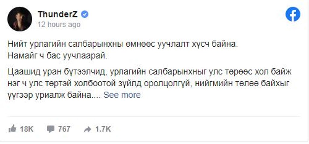 Түүнчлэн реппер ThunderZ "Цаашид уран бүтээлчид, урлагийн салбарынхныг улс төрөөс хол байж нэг ч улс төртэй холбоотой зүйлд оролцолгүй, нийгмийн төлөө байхыг үүгээр уриалж байна" гэсэн юм.
