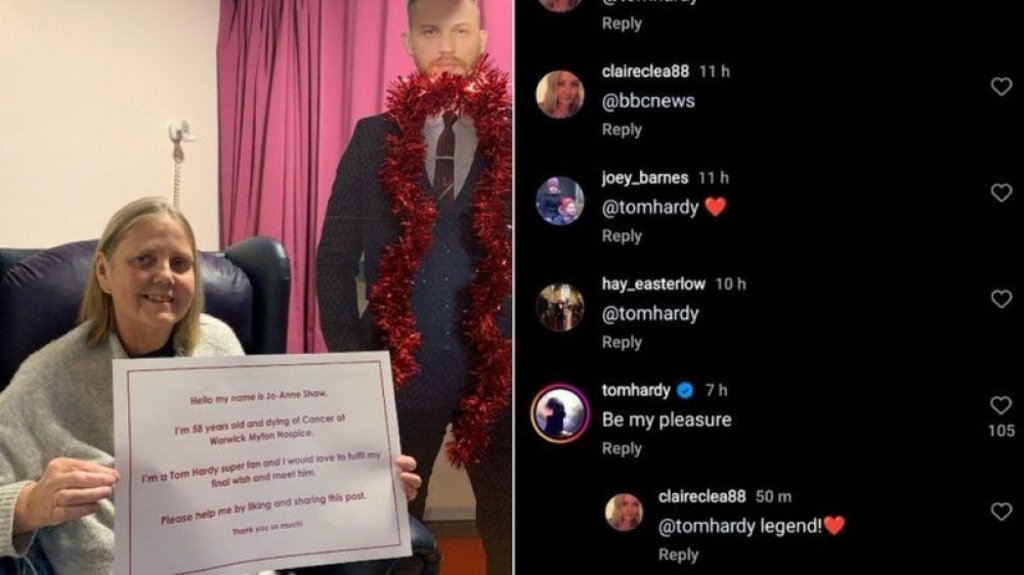 Жо-Энн Шү Их Британид эмнэлэгт хэвтэж байхдаа мөрөөдлөө биелүүлэхээр кампанит ажил эхлүүлжээ. Энэ талаар олж мэдсэн Том Харди ч видео дуудлага хийх хүсэлтэй байгаагаа илэрхийлсэн байна.