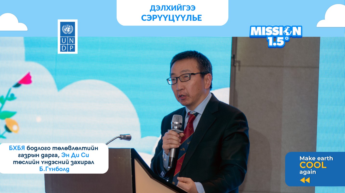 Түүнчлэн арга хэмжээнд хүрэлцэн ирсэн зочдод НҮБ-ын Хөгжлийн хөтөлбөрийн Монгол дахь суурин төлөөлөгч Илейн Конкиевич болон БХБЯамны бодлого төлөвлөлтийн газрын дарга, Эн Ди Си төслийн газрын захирал Б.Гүнболд нар мэндчилгээ дэвшүүлсэн юм. Харин Эн Ди Си төслийн үндэсний зохицуулагч Д.Саруул хүүхэд, залуустаа дэлхийн хүлэмжийн хийн ялгарлыг яагаад 1.5 хэмд хязгаарлах ёстойг шинжлэх ухааны үндэслэлтэйгээр тайлбарлаж өглөө.
