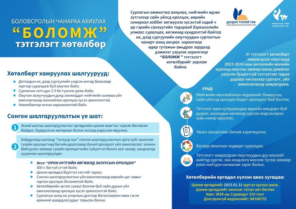 Сурлагын амжилтаа ахиулах, нийгмийн идэвх зүтгэлээр сайн үйлсд оролцох, өөрийн сонирхол хоббиг хөгжүүлэх хүсэлтэй хэдий ч ар гэрийн санхүүгийн тодорхой бэрхшээлийн улмаас суралцах, хөгжихөд хүндрэлтэй байгаа их, дээд сургуулийн оюутнуудын сургалтын чанарт ахиц авчрах зорилгоор өдөр тутамын амьдрах зардалд дэмжлэг үзүүлэх зорилгоор Монголын сайн дурынхны төв-Volunteer center of Mongolia -тэй хамтран15 оюутанд БОЛОМЖ тэтгэлэгт хөтөлбөрийг зарлаж байна.