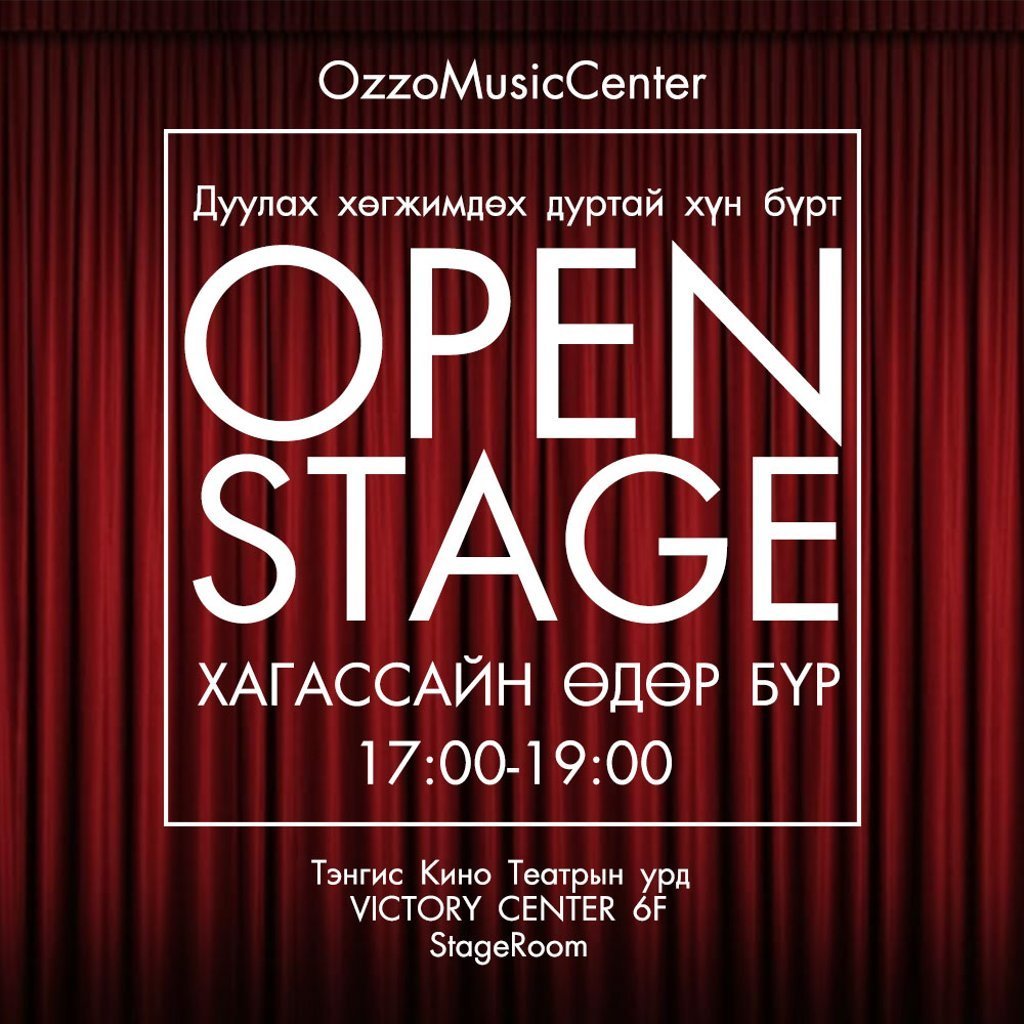 Тайлбар: Дуулах хөгжимдөх дуртай залуусын чөлөөт цагаа өнгөрүүлэх орчныг бүрдүүлж хүн бүрд нээлттэйгээр залуус нэг оройг хамтдаа хөгжилтэй өнгөрүүлэх #OPENSTAGE арга хэмжээг. Долоо хоног бүрийн хагассайн өдөр Тэнгис Кино театрын чанх урд VICTORYCENTER ийн Б корпус 6 давхарт STAGEROOM зааланд зохион байгуулхаaр боллоо. Долоо хоног бүр OPENSTAGE-д оролцсон оролцогчдоос нэг шилдгийг шалгаруулж #OzzoArtistLabel ковер бичлэг хийлгэх эрхээр шагнана.
