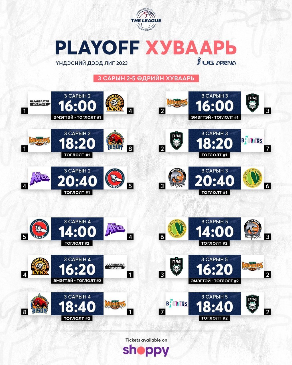 Play-Off-ын тоглолтууд гуравдугаар сарын 2-оос дөрөвдүгээр сарын 16-ыг дуустал үргэлжилнэ.