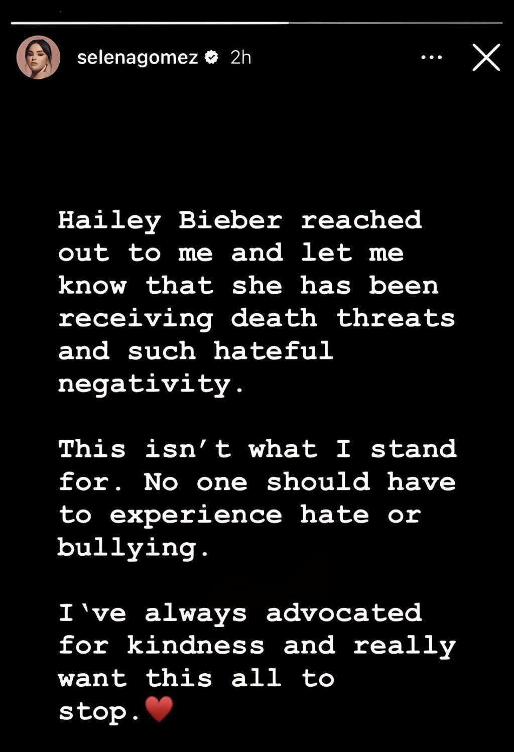 “Hailey Bieber хүмүүсээс маш их үзэн ядалт, дарамт, амь насанд заналхийлсэн зүйл мэдэрч байгаагаа хэлсэн. Би үүнийг дэмжихгүй байна. Хэн ч үзэн ядалт, дарамт мэдрэх ёсгүй. Би нэг нэгэндээ сайхан сэтгэлээр хандахыг үргэлж уриалсаар ирсэн. Бас энэ бүхнийг дуусгахыг үнэхээр их хүсэж байна.”
