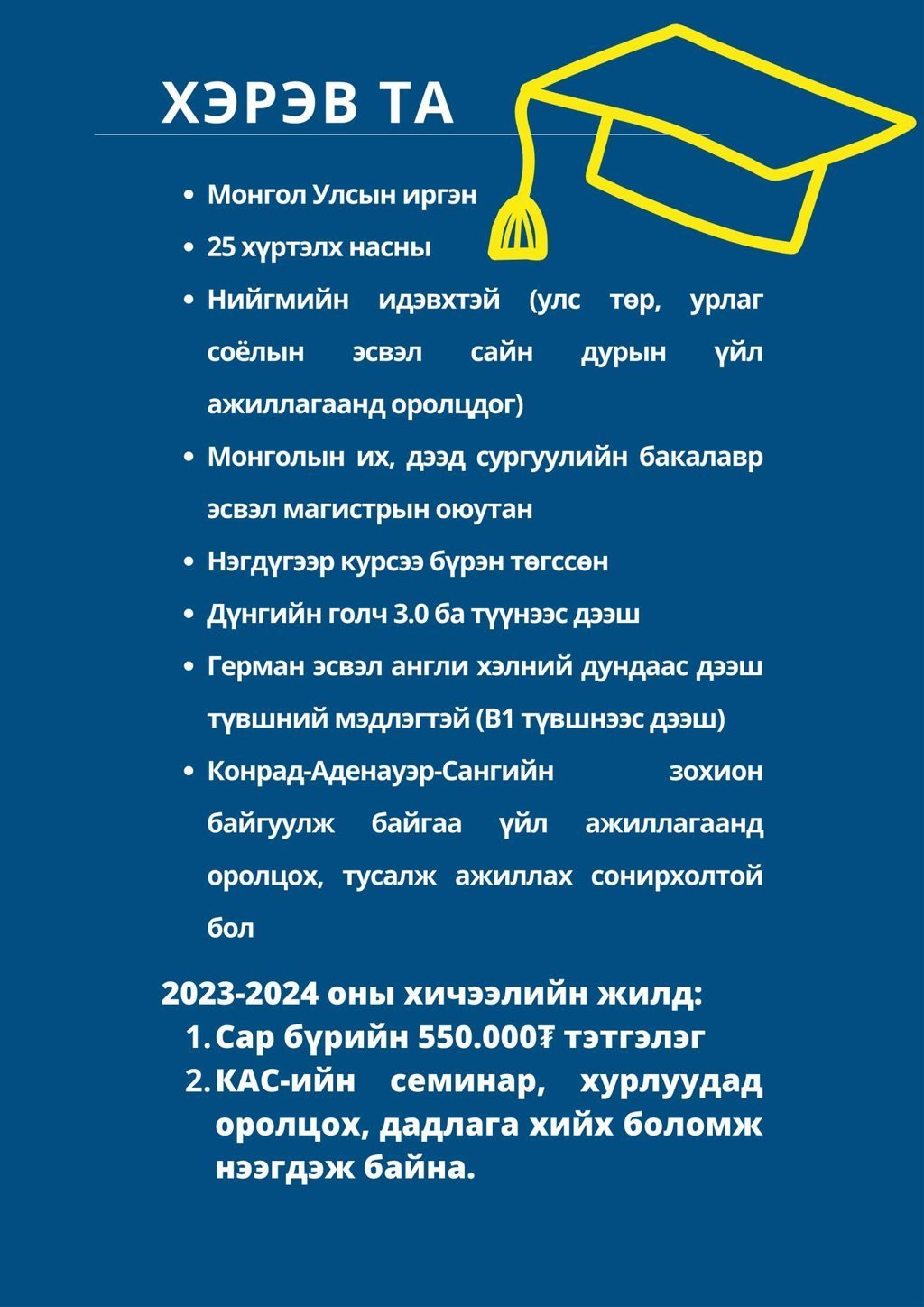 ХБНГУ-ын Конрад-Аденауэр-Сан Монгол Улсад суралцаж буй шилдэг оюутнуудад зориулсан Үндэсний тэтгэлэгт хөтөлбөрөө зарлажээ.