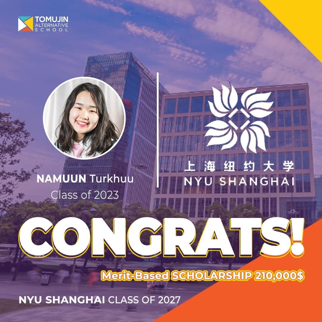 - Сайн байцгаана уу? Намайг Т.Намуун гэдэг. Би Томүжин Алтернатив сургуулийн 12 дугаар ангид суралцдаг. Өнгөрсөн өвөл Америкийн 20 их сургуульд өргөдлөө илгээгээд аравт нь тэнцэж New York University Shanghai /NYU Shanghai/ буюу Нью Йоркийн их сургуулийн Шанхай дахь салбар сургуулийг сонгон суралцахаар болсон. 9 дүгээр анги хүртлээ Хэнтий аймгийн Хэрлэн сумын 1 дүгээр сургуульд суралцаж байгаад 10 дугаар ангиасаа хойш Томүжин Алтернатив сургуульд суралцаж байна.