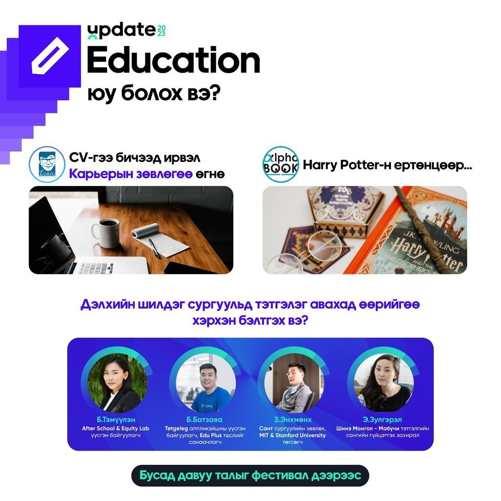 Өнгөрсөн жил 1500 гаруй залуусыг нэгтгэсэн “Update 2022”эвент энэ жил улам өргөжиж, нийгмийн оролцоотой байх хүсэлтэй хүн бүрд үүд хаалгаа нээн, арван мянган залуусыг нэгтгэх гэж байна. Хамтын сэтгэлгээ, олон талт оролцоон дор бүрдэж буй уг фестиваль зургаадугаар сарын 24-25-нд зохион байгуулагдах гэнэ.