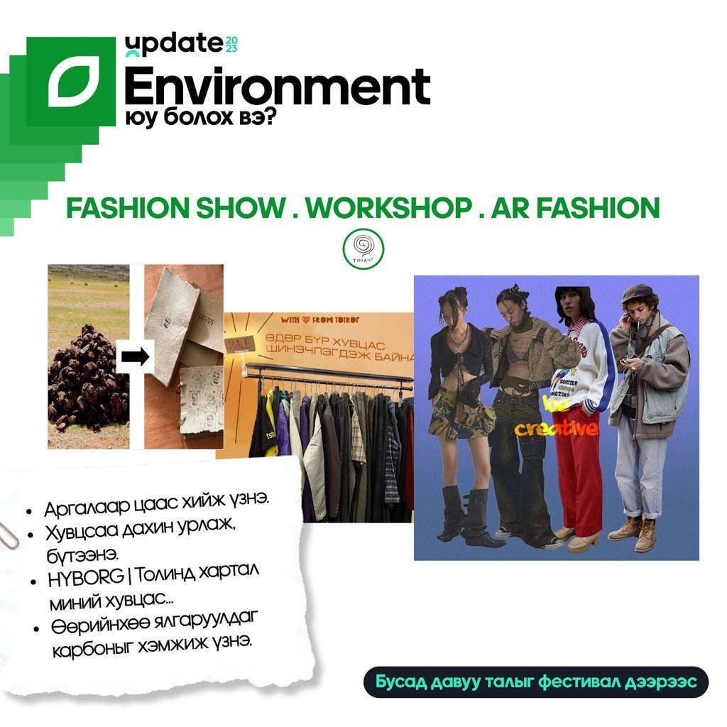 Эргэн тойронд буй ямар нэгэн зүйлийг өөрчлөх юм сан гэх бодол төрдөг үү? Аливаа зүйлийн утга учрыг мэдэж, шинээр сэдэж Update хиймээр байна уу? Тэгвэл анхаарлаа нааш нь хандуулаарай. ЦойлогсоZ болон Лантуун дохио ТББ, Үндэсний Соёл Амралтын Хүрээлэн хамтран нийгэмдээ эерэг, бодит өөрчлөлтийг бий болгох хүсэлтэй хүн бүрд зориулан "Update 2023" фестивалийг зохион байгуулах гэж байна.