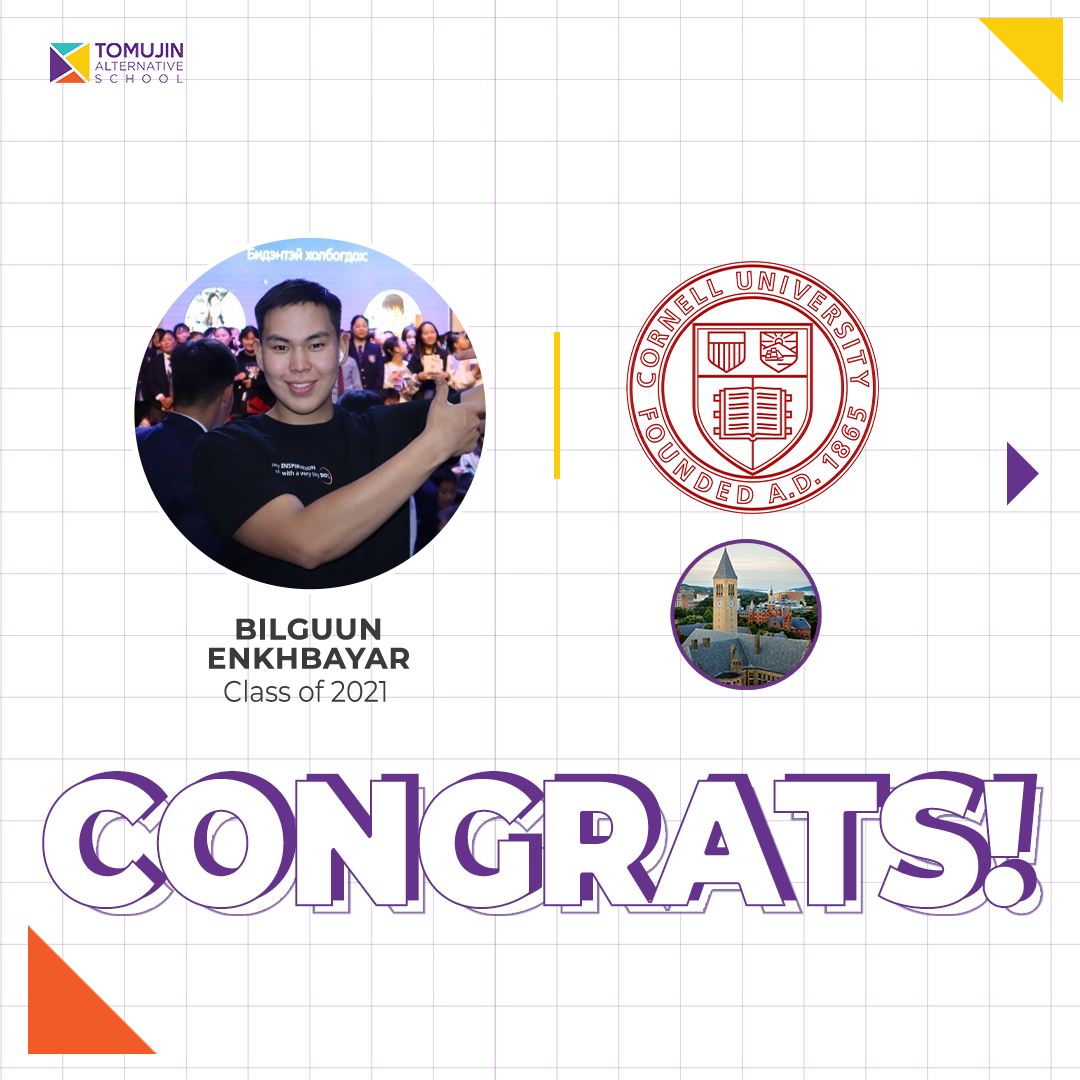 Намайг Энхбаярын Билгүүн гэдэг. Би Томүжин Альтернатив сургуулийн ууган төгсөгчдийн нэг. Корнеллийн их сургуульд 328 мянган долларын тэтгэлэг хүртсэн 2027 оны төгсөгч байна.