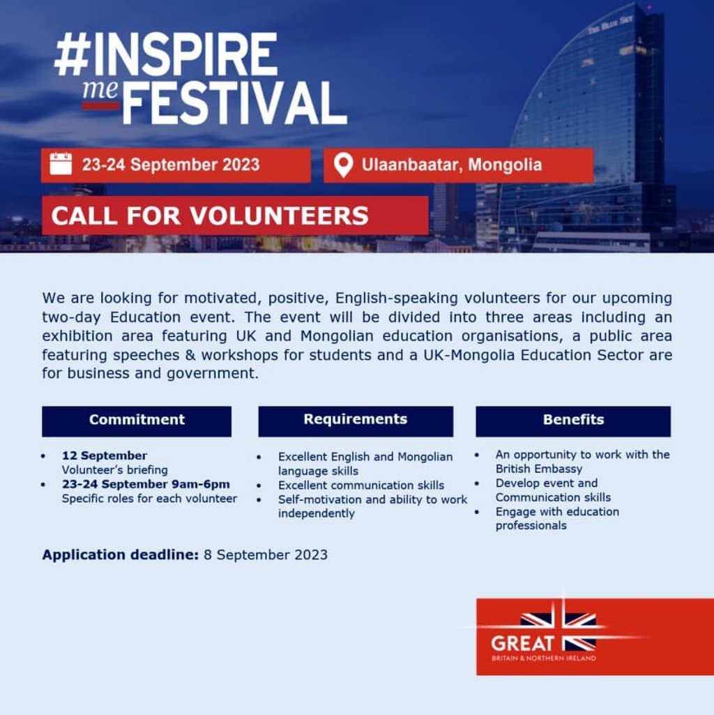 Британийн боловсролын өдөрлөг "Inspire me 2023" фестиваль есдүгээр сарын 23-24-ны өдрүүдэд White Rock centre-д болно. Тус өдөрлөгт хувь нэмрээ оруулан, арга хэмжээ зохион байгуулах ур чадвараа дээшлүүлэх хүсэлтэй залуучуудыг сайн дурын ажилтнаар бүртгэж байна.