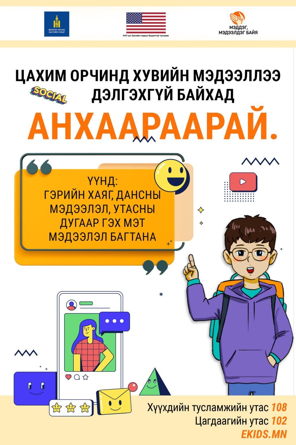 Иймд АНУ-ын Төрийн департаментын санхүүжилтээр ХЗДХЯ, ХНХЯ, Дэлхийн зөн Монгол олон улсын байгууллага, Азийн сан, “Монгол Контент” ХХК хамтран хэрэгжүүлж буй хүн худалдаалах гэмт хэрэгт хүүхэд өртөхөөс урьдчилан сэргийлэх “Мэддэг мэдээлдэг байя” аяны хүрээнд “Цахим орчин ашигтай ч аюултай” агуулгын хүрээнд дараах контентыг бэлтгэн хүргэж байна.