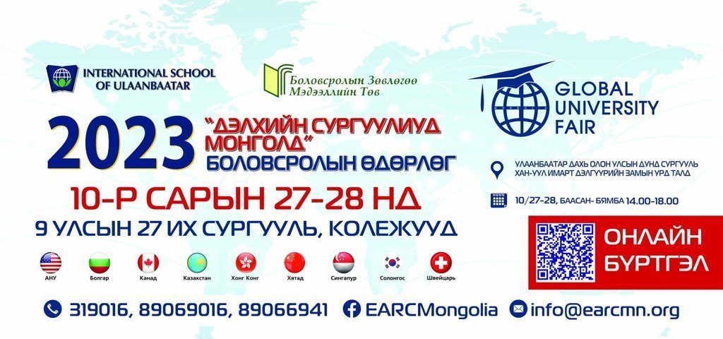 Жил бүр Монгол залуус гадаадад өндөр боловсрол эзэмших нь нэмэгдэж байгаа билээ. Эдгээр сурагч, оюутан залууст үнэн зөв, мэдээлэл хүргэх зорилгоор 2016 оноос хойш Боловсролын Зөвлөгөө Мэдээллийн Төв (#EARC), Улаанбаатар дахь Олон Улсын Дунд Сургууль (#ISU) хамтран долоо дахь жилдээ "Global University Fair 2023" буюу “Дэлхийн сургуулиуд Монголд 2023” боловсролын өдөрлөгийг 2023 оны 10-р сарын 27-28-ны өдрүүдэд зохион байгуулах гэж байна.
