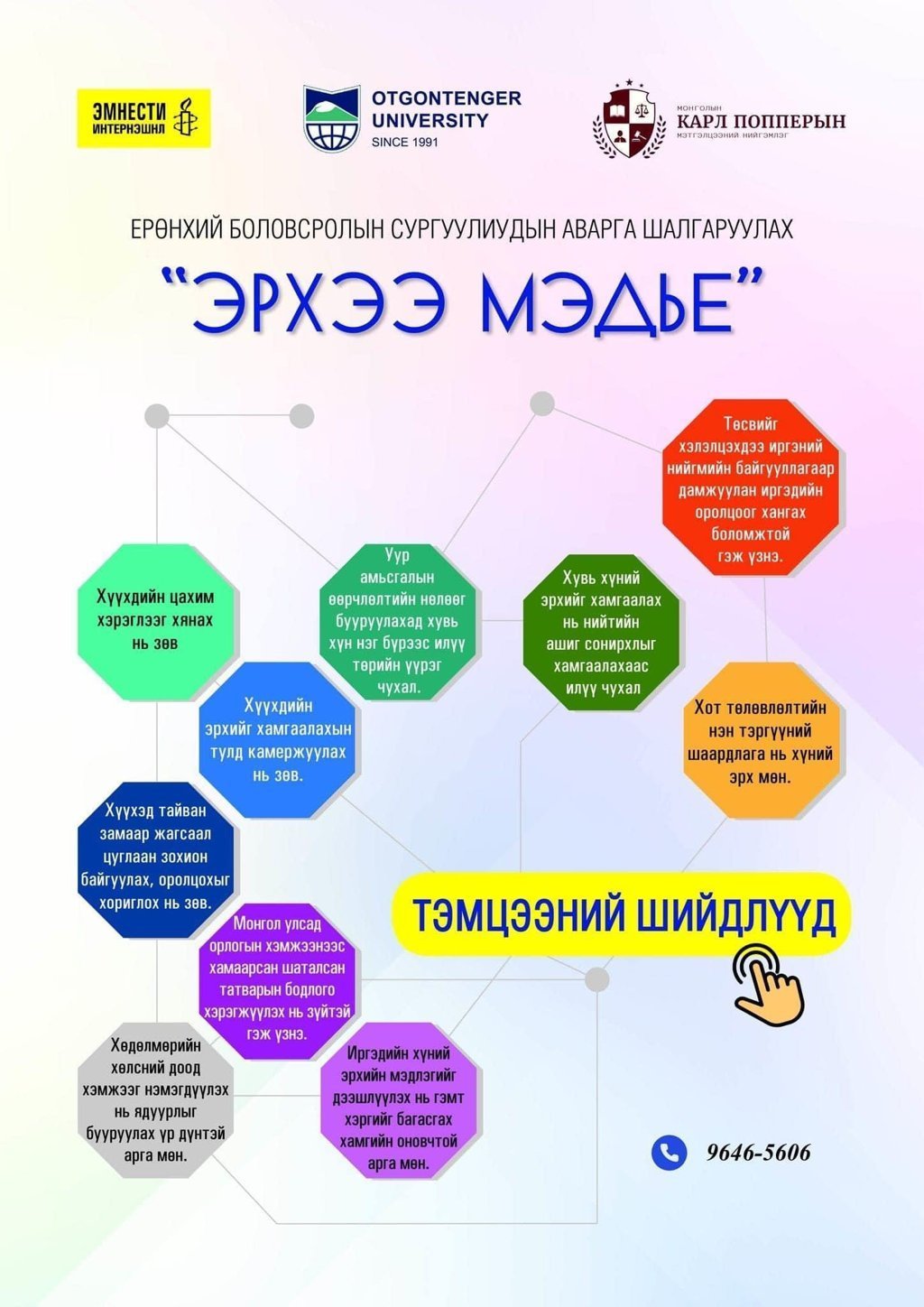 Монголын Эмнести Интернэшнл, Отгонтэнгэр их сургууль, Монголын Карл Попперын мэтгэлцээний нийгэмлэг жил бүр хамтран 13 дахь жилдээ зохион байгуулж буй АНХЛАН МЭТГЭЛЦЭГЧДЭД зориулсан "Эрхээ мэдье" мэтгэлцээний тэмцээний бүртгэл нээгдлээ.