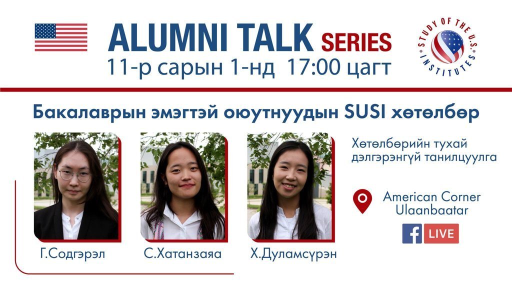 ЭСЯ-наас бакалаврын эмэгтэй оюутнуудад зориулсан зуны солилцооны Study of U.S. Institute (SUSI) for Young Women Leaders хөтөлбөрийн тухай дэлгэрэнгүй танилцуулга хийх гэж байна. Энэхүү хөтөлбөр нь манлайлах ур чадвараа дээшлүүлэх сонирхолтой эмэгтэй оюутнуудад зориулсан. Хэрэв та өргөдөл гаргах хүсэлтэй байгаа бол 11-р сарын 1-ний өдөр Улаанбаатар хот дахь Америкийн төвд хүрэлцэн ирээрэй. Хөтөлбөрийн 2023 оны оролцогчид болох Г.Содгэрэл, Х.Дуламсүрэн, С.Хатанзаяа нар ирсэн зочидтой хөтөлбөрийн талаар болон өөрсдийн туршлагаа хуваалцан ярилцлага өрнүүлнэ.